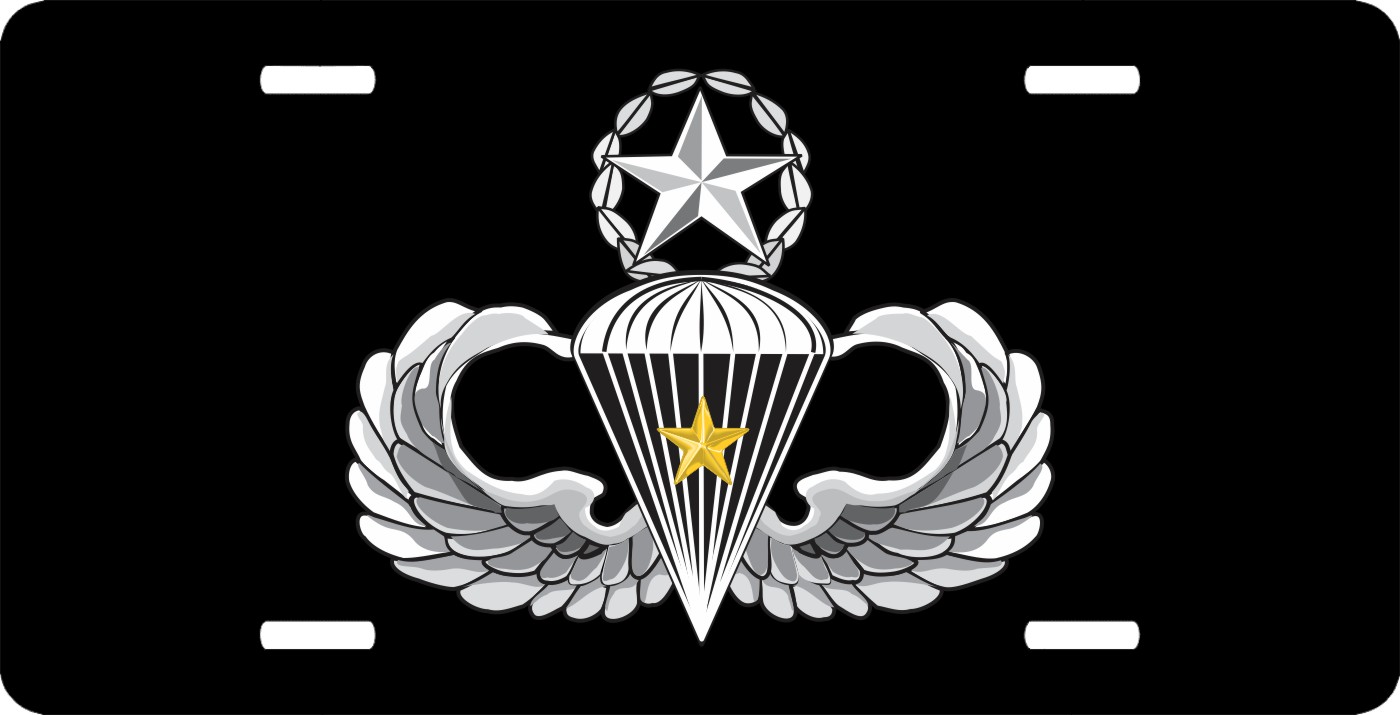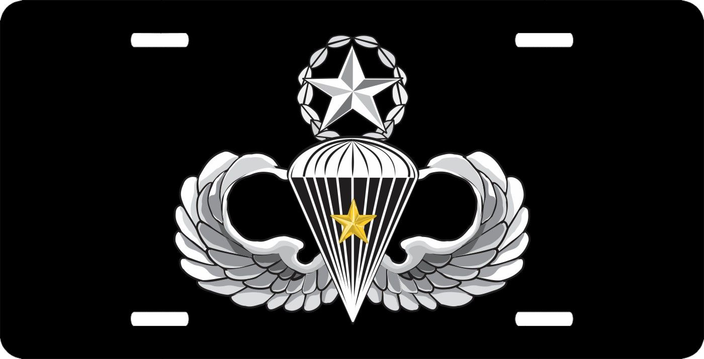 This Army Master 5 Combat Jump Wings License Plate is made from heavy gauge aluminum and has a baked enamel finish to last for many years of use. Each plate measures 5 15/16" x 11 15/16". This license plate would make a wonderful addition to your collection or a great gift.