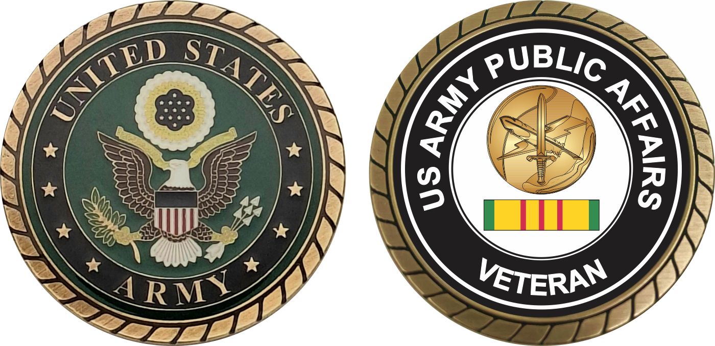 This 1 3/4” Army Public Affairs Vietnam Veteran Challenge Coin is proudly offered by MilitaryBest. This Officially Licensed Army coin has beautiful enamel finish on one side and an organized crisp clean Army Public Affairs Vietnam Veteran design on the opposite side.