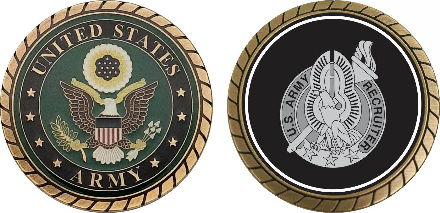 This 1 3/4” Army Recruiter Gray Badge Challenge Coin is proudly offered by Militarybest. This Officially Licensed Army coin has beautiful enamel finish on one side and an organized crisp clean design on the opposite side.
