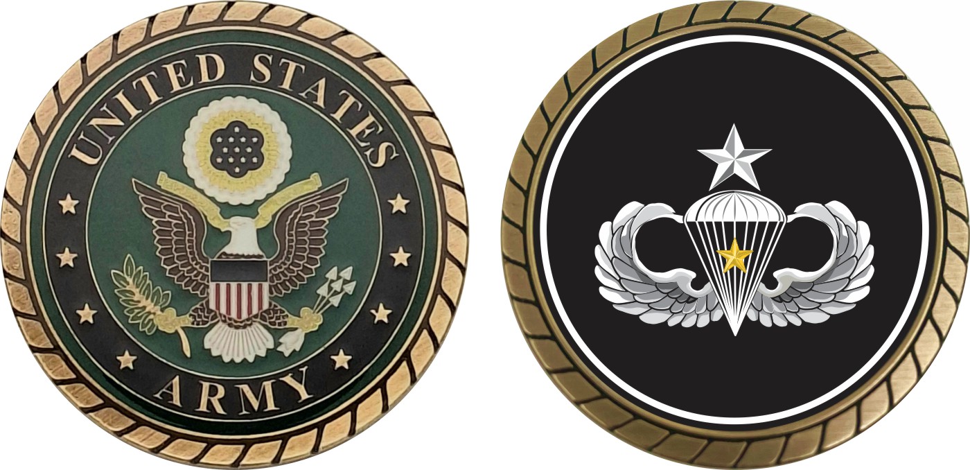 This 1 3/4” Army Senior 5 Combat Jump Challenge Coin is proudly offered by Militarybest. This Officially Licensed Army coin has beautiful enamel finish on one side and an organized crisp clean design on the opposite side.
