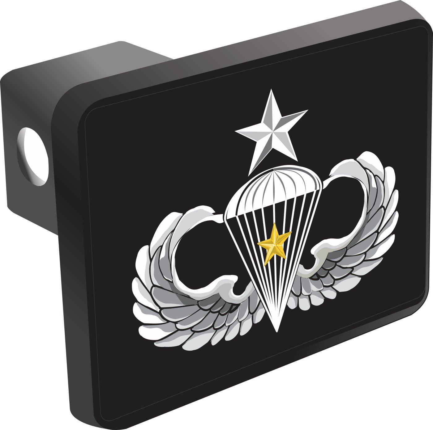 This Army Senior 5 Combat Jump Hitch Cover is proudly Made in the USA. Each Hitch Cover's face plate measures 4.7" x 3.4" and is applied on a black heavy duty injection molded plastic 2" hitch cover; link pin not included. The face plate of the hitch cover is sublimation printed to provide a beautiful glossy finish sure to catch the eye. This hitch cover would make a wonderful addition to your truck or other vehicle.A percentage of the sale of each MilitaryBest item is forwarded to the licensing departments of each respective branch of service in support of the MWR (Morale, Welfare, & Recreation) program. These payments are made by either ALL4U LLC or the wholesaler from where the item originated. Our team thanks you for your service and your support of these programs.