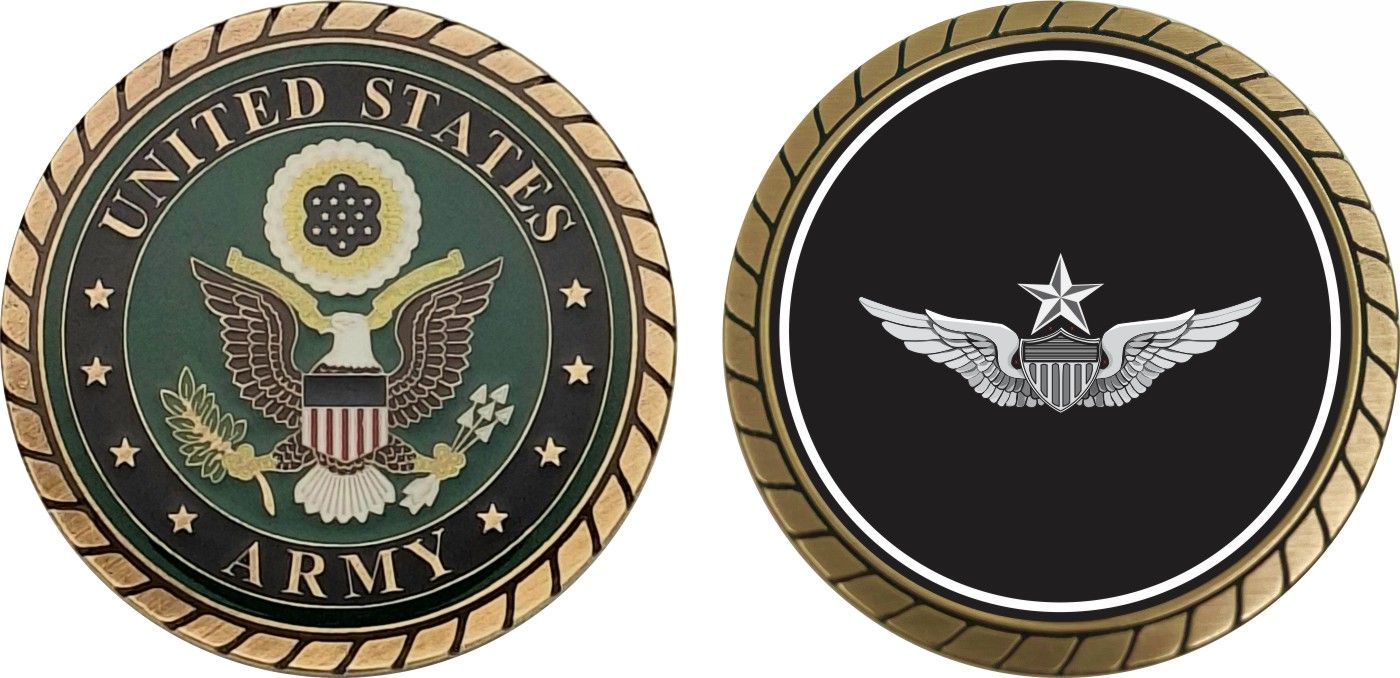 This 1 3/4” Army Senior Aviator Wing Challenge Coin is proudly offered by Militarybest. This Officially Licensed Army coin has beautiful enamel finish on one side and an organized crisp clean design on the opposite side.