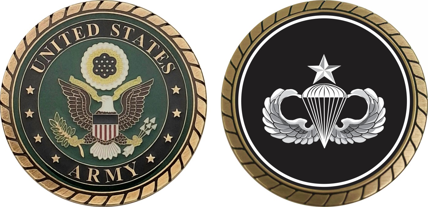 This 1 3/4” Army Senior Parachutist Wings Challenge Coin is proudly offered by Militarybest. This Officially Licensed Army coin has beautiful enamel finish on one side and an organized crisp clean design on the opposite side.