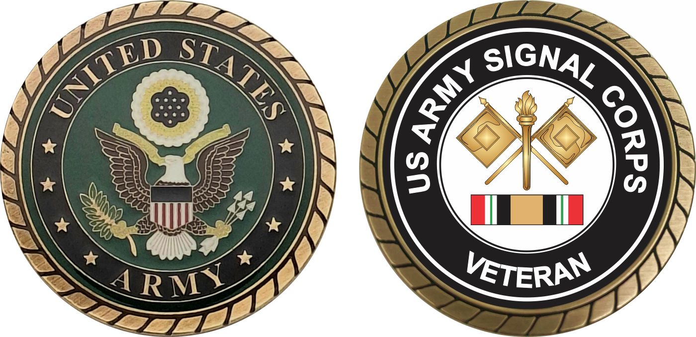 This 1 3/4” Army Signal Corps Iraq Veteran Challenge Coin is proudly offered by MilitaryBest. This Officially Licensed Army coin has beautiful enamel finish on one side and an organized crisp clean Army Signal Corps Iraq Veteran design on the opposite side.
