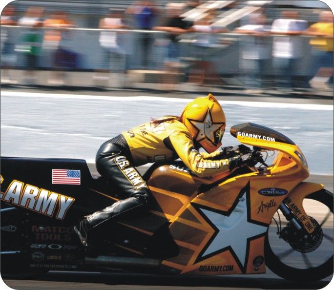 Each of our Operation Iraqi Freedom / Enduring Freedom Collection mouse pads are proudly made in the USA at our Jacksonville, Florida facilities with sharp, colorful graphics. The pads measure 9" in width by 7 3/4" in height and are 1/4" thick.This Army of 180 M.P.H. mouse pad features Army Pro Stock motorcycle drag racer Angelle Sampey ripping past the crowd at more than 180 miles per hour during the Mac Tools U.S. Nationals competition in Indianapolis, Ind. Sampey was eliminated in the semi-final round.