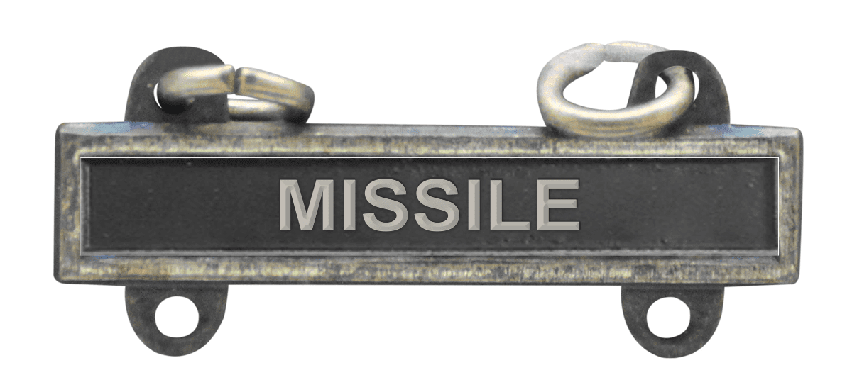MilitaryBest is proud to offer this regulation Army Qualification Bar Missile - Oxidized Finish. It is the same badge that is supplied to the U.S. Military. All MilitaryBest's Regulation Full Size Badges are of the highest quality available. We are proud to offer these badges in our product offerings. By ordering this badge you are confirming that it has been earned.