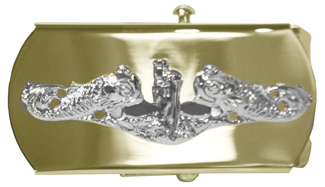 This Belt Buckle is made for Veterans and Active Duty Chief Petty Officers of the United States Navy Submarine Service. Buckle features Silver Dolphins on the Gold front plate and is designed for use with Vanguard's Cotton Web Belts. Each buckle is 3" Wide and Made in the USA!