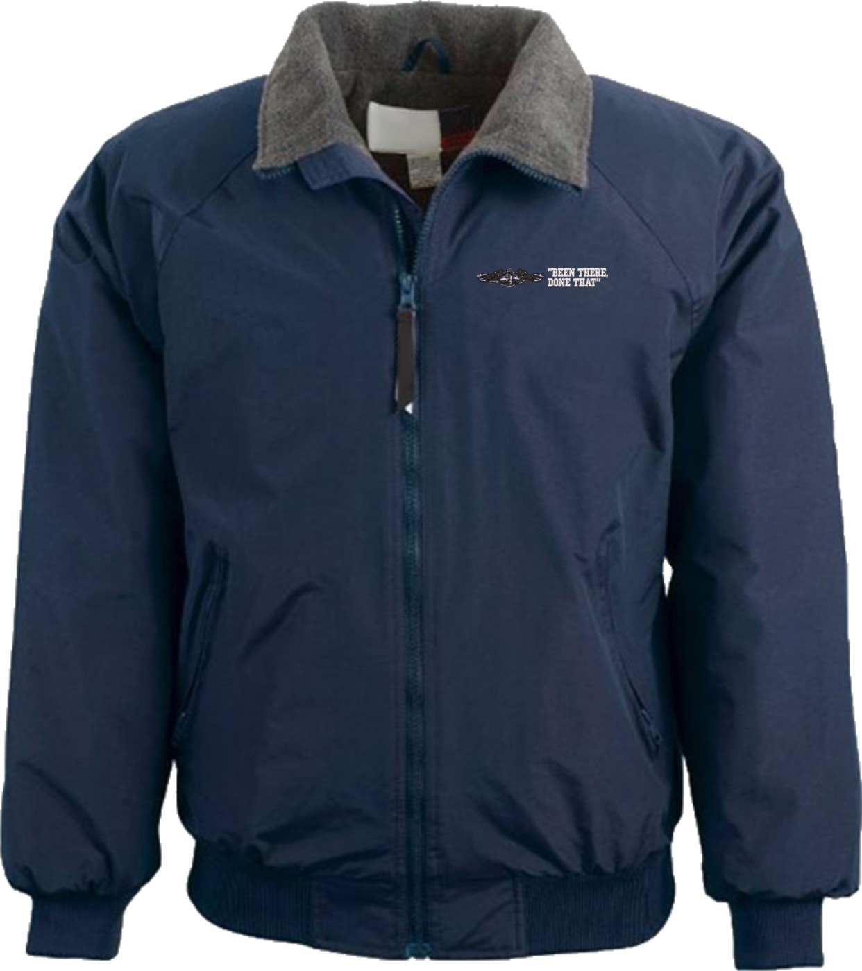 Note: Some of the Color Options pictured may not be available. Available Color Options are listed on the drop down menu above.MilitaryBest is proud to offer this quality U.S. Navy Enlisted Silver Dolphins Been There Done That 3-Season Jacket. Each three season jacket is made from a 3-Layer system consisting of a nylon shell, an insulator layer, Nylon-lined sleeves, and an inside layer of fleece for comfort. Each jacket’s features include a sturdy black enamel front-zipper, raglan sleeves, outsize zip pockets, an inside zip security pocket, YKK zippers, and a banded-bottom. As with all MilitaryBest products, your satisfaction is guaranteed! This jacket can be worn in fall, winter, and spring and is proudly custom embroidered at our facilities in Scottsboro, AL.