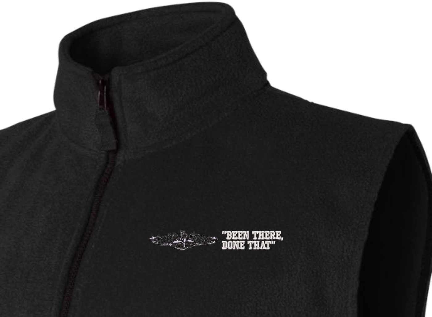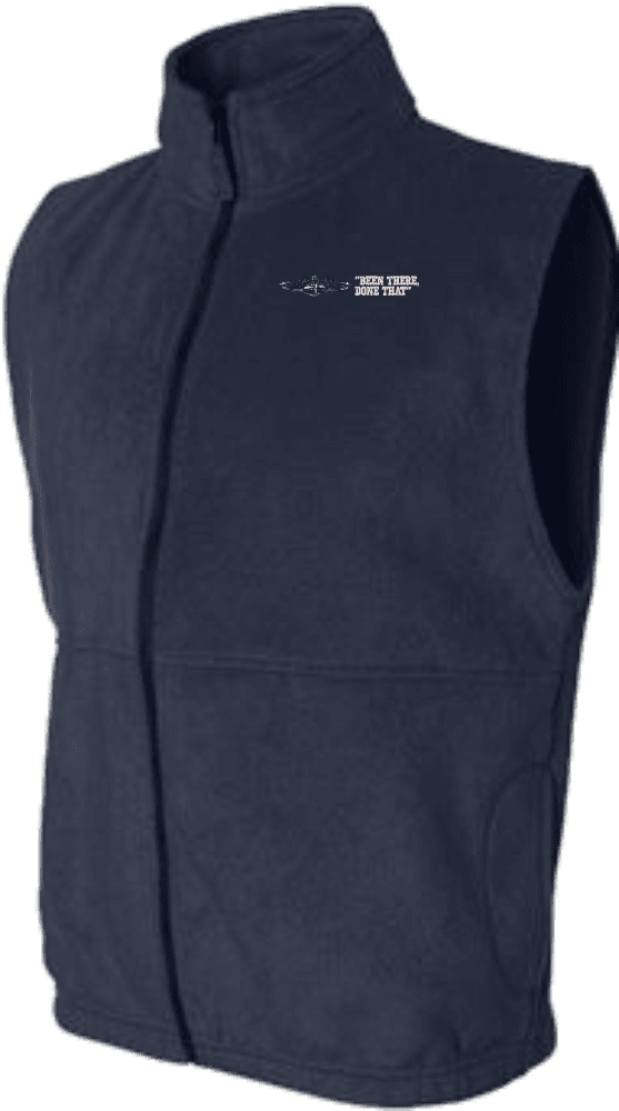 Due to supply chain disruptions, some colors and sizes may not be available in the same Brand, in these cases a brand of comparable quality will be used. Feel free to call in advance of your order, with questions you may have.MilitaryBest is proud to offer this quality U.S. Navy Enlisted Silver Dolphins Been There Done That Full Zip Fleece Vest. Our U.S. Navy Full Zip Fleece Vest features a convertible collar with dyed-to-match zipper pull and oversized nylon reinforced slash pockets. These Military Vests are proudly embroidered at our facilities in Scottsboro, AL.