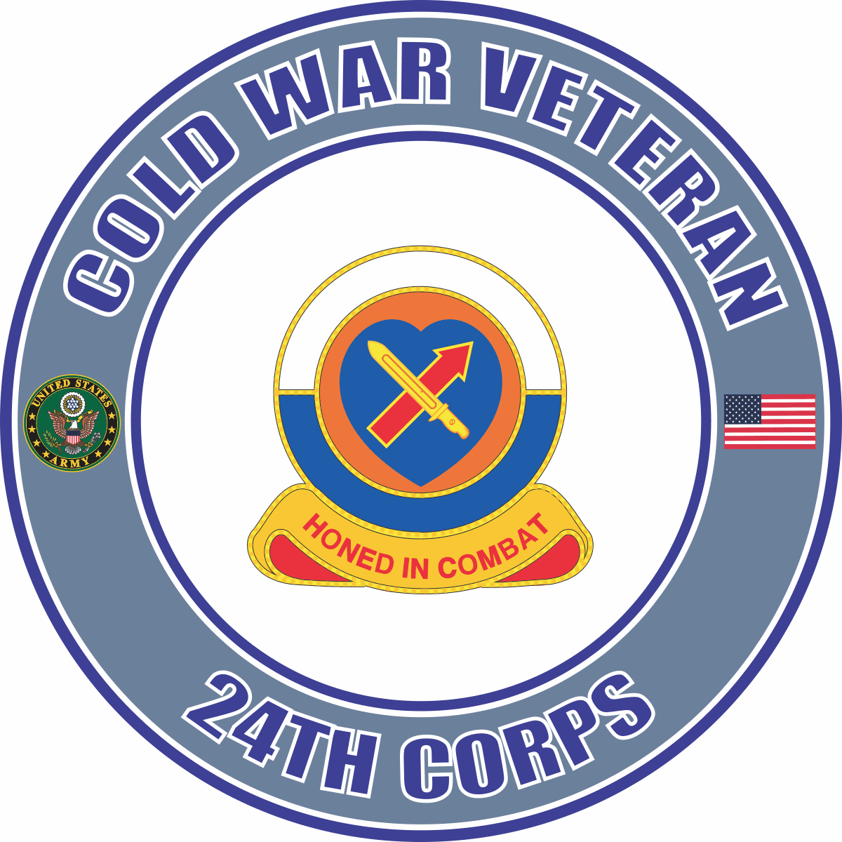 This U.S. Army Cold War 24th Corps Veteran Decalis Made in the USA at our facilities in Scottsboro, Alabama. Each U.S. Army Cold War 24th Corps Veteran Decalis made using the finest ink and vinyl available and all are made for outside applications. We have been producing high quality Military Decals for over 10 years and we guarantee the quality of each one. Choose from several sizes, and click the 'ADD TO CART' button. For bulk pricing for custom and wholesale decals click here: Custom & Wholesale Decals!*MilitaryBest customers use our decals on a variety of surfaces, however, their intended purpose is for windshield applications.