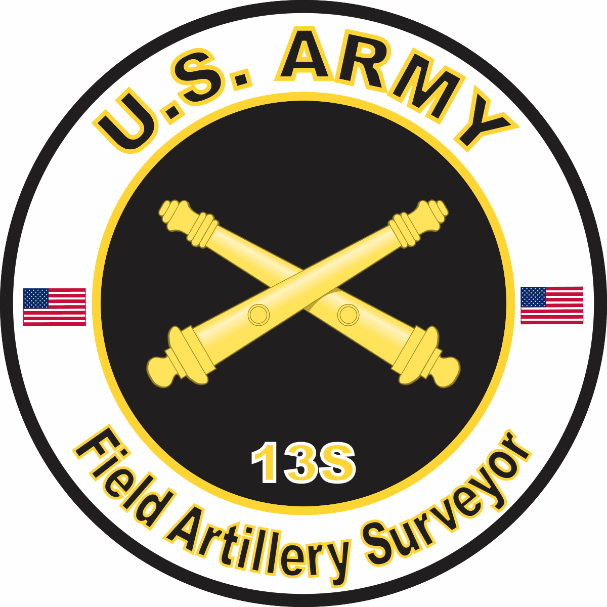 This U.S. Army MOS 13S Field Artillery Surveyor sticker is Made in the USA at our facilities in Scottsboro, Alabama. Each U.S. Army MOS 13S Field Artillery Surveyor Decal is made using the finest Ink, Vinyl and Laminate available and all are made for outside applications but are best suited for application to glass and windshields. Our production teams have been producing high quality Military Decals for over 15 Years and we guarantee the quality of each one. Always remember to apply to a clean, dry surface. Choose from several sizes, and click the 'ADD TO CART' button. For bulk pricing for custom and wholesale decals click here: Custom & Wholesale Decals!