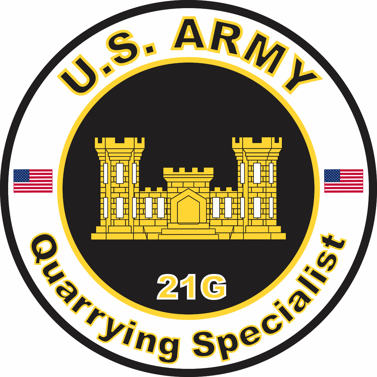 This U.S. Army MOS 21G Quarrying Specialist sticker is Made in the USA at our facilities in Scottsboro, Alabama. Each U.S. Army MOS 21G Quarrying Specialist Decal is made using the finest Ink, Vinyl and Laminate available and all are made for outside applications but are best suited for application to glass and windshields. Our production teams have been producing high quality Military Decals for over 15 Years and we guarantee the quality of each one. Always remember to apply to a clean, dry surface. Choose from several sizes, and click the 'ADD TO CART' button. For bulk pricing for custom and wholesale decals click here: Custom & Wholesale Decals!