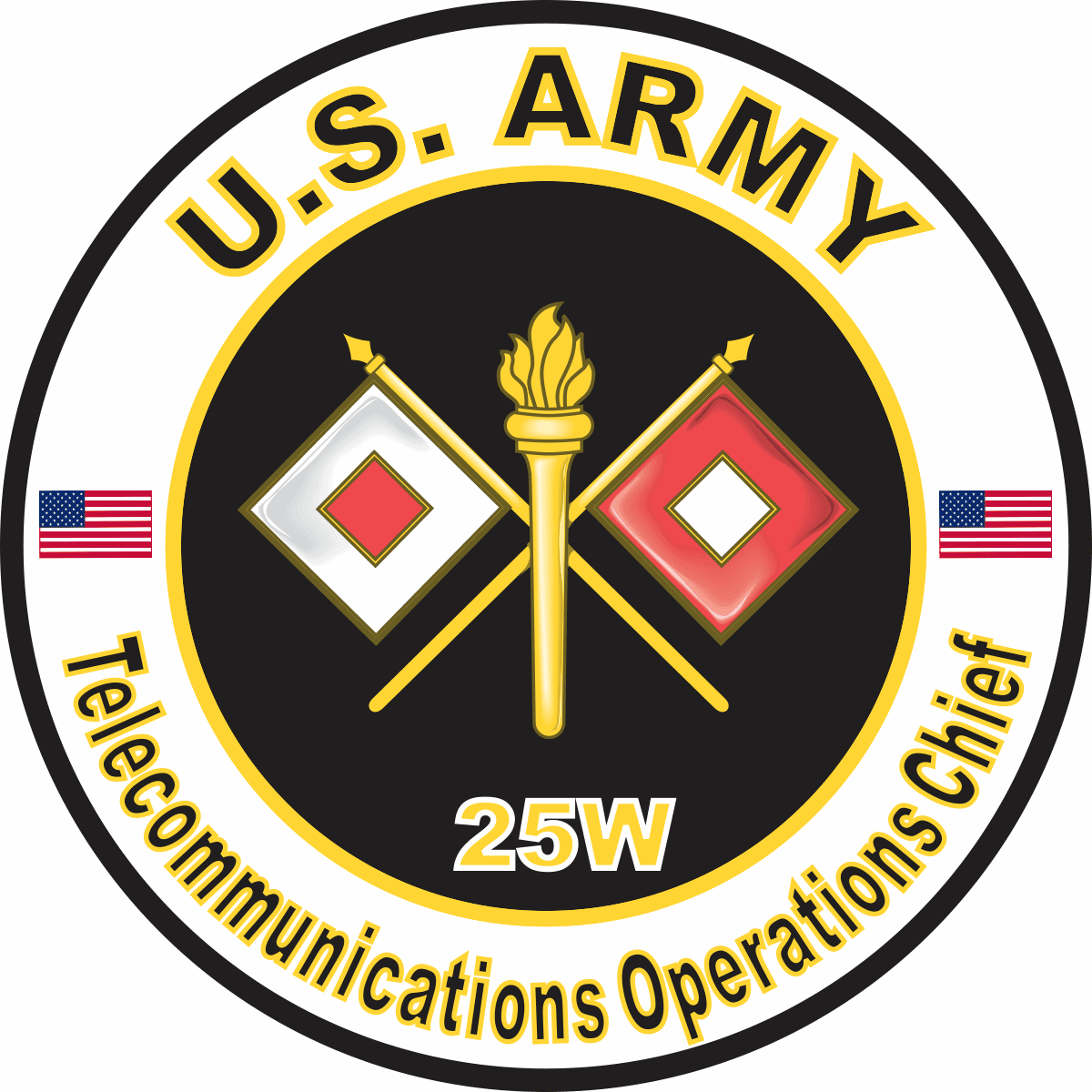 This U.S. Army MOS 25W Telecommunications Operations Chief sticker is Made in the USA at our facilities in Scottsboro, Alabama. Each U.S. Army MOS 25W Telecommunications Operations Chief Decal is made using the finest Ink, Vinyl and Laminate available and all are made for outside applications but are best suited for application to glass and windshields. Our production teams have been producing high quality Military Decals for over 15 Years and we guarantee the quality of each one. Always remember to apply to a clean, dry surface. Choose from several sizes, and click the 'ADD TO CART' button. For bulk pricing for custom and wholesale decals click here: Custom & Wholesale Decals!
