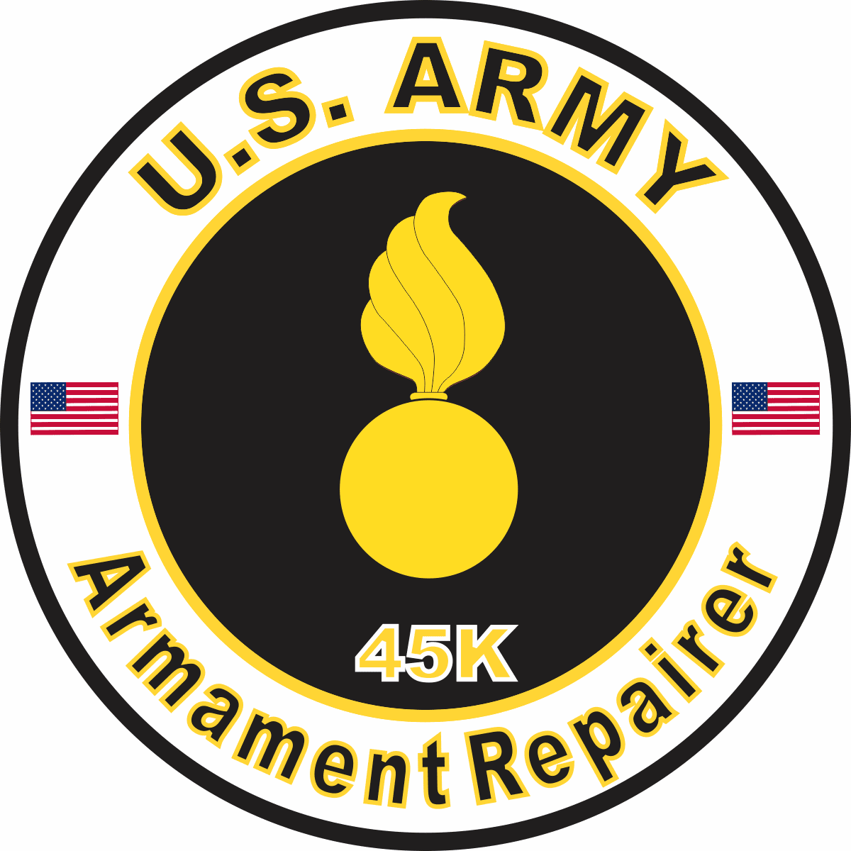 This U.S. Army MOS 45K Armament Repairer sticker is Made in the USA at our facilities in Scottsboro, Alabama. Each U.S. Army MOS 45K Armament Repairer Decal is made using the finest Ink, Vinyl and Laminate available and all are made for outside applications but are best suited for application to glass and windshields. Our production teams have been producing high quality Military Decals for over 15 Years and we guarantee the quality of each one. Always remember to apply to a clean, dry surface. Choose from several sizes, and click the 'ADD TO CART' button. For bulk pricing for custom and wholesale decals click here: Custom & Wholesale Decals!