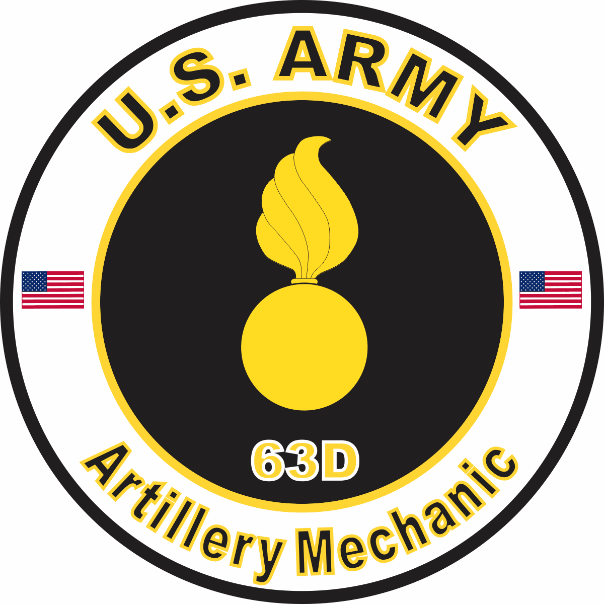 This U.S. Army MOS 63D Artillery Mechanic sticker is Made in the USA at our facilities in Scottsboro, Alabama. Each U.S. Army MOS 63D Artillery Mechanic Decal is made using the finest Ink, Vinyl and Laminate available and all are made for outside applications but are best suited for application to glass and windshields. Our production teams have been producing high quality Military Decals for over 15 Years and we guarantee the quality of each one. Always remember to apply to a clean, dry surface. Choose from several sizes, and click the 'ADD TO CART' button. For bulk pricing for custom and wholesale decals click here: Custom & Wholesale Decals!