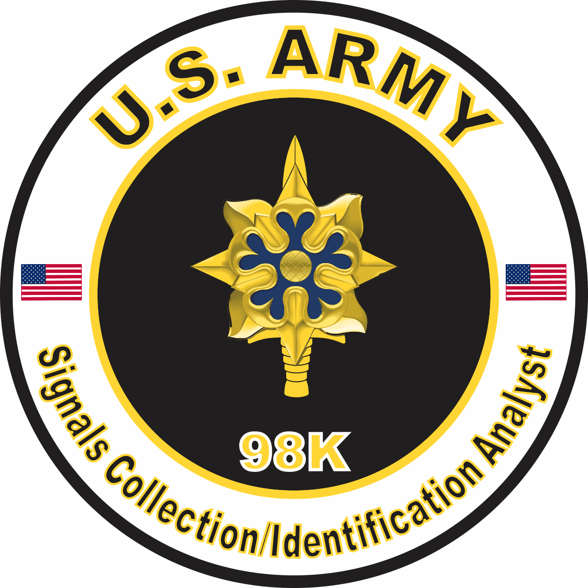 This U.S. Army MOS 98K Signals Collection Identification Analyst sticker is Made in the USA at our facilities in Scottsboro, Alabama. Each U.S. Army MOS 98K Signals Collection Identification Analyst Decal is made using the finest Ink, Vinyl and Laminate available and all are made for outside applications but are best suited for application to glass and windshields. Our production teams have been producing high quality Military Decals for over 15 Years and we guarantee the quality of each one. Always remember to apply to a clean, dry surface. Choose from several sizes, and click the 'ADD TO CART' button. For bulk pricing for custom and wholesale decals click here: Custom & Wholesale Decals!