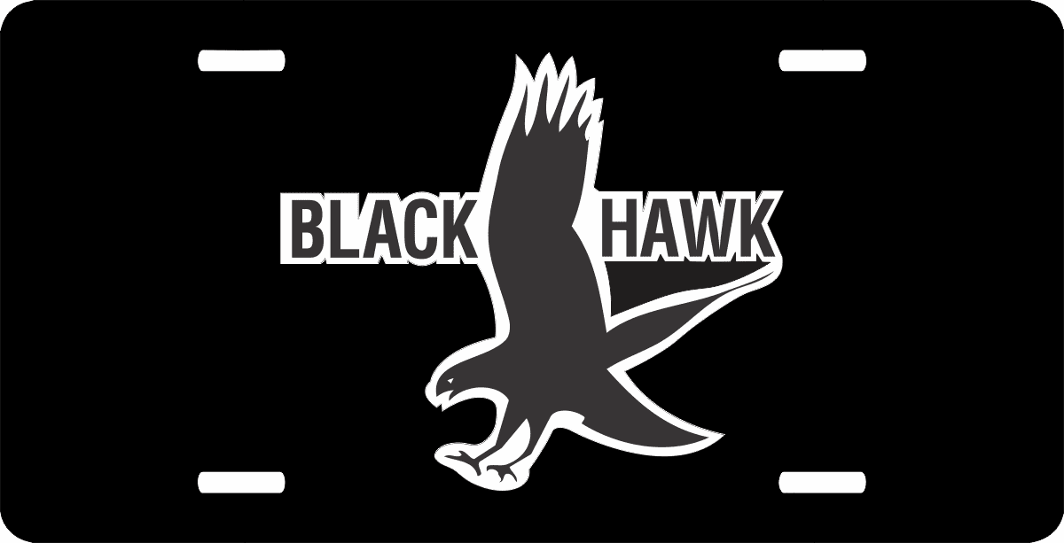This Black Hawk License Plate is made from heavy gauge aluminum and has a baked enamel finish to last for many years of use. Each plate measures 5 15/16" x 11 15/16". This license plate would make a wonderful addition to your collection or a great gift.