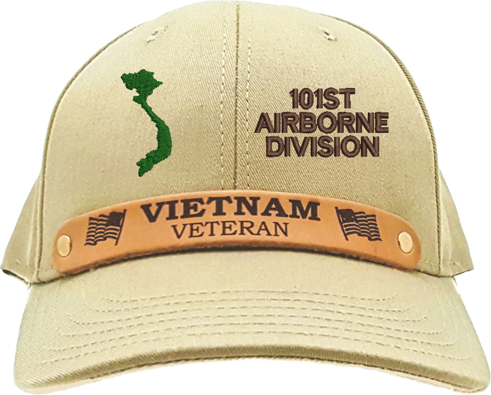 MilitaryBest is proud to offer this Made in the USA 101st Airborne Division Vietnam Veteran Leather Strap Cap. The hand crafted leather strap is engraved and attached to a Made in the USA Khaki cap with a hand crafted adjustable leather strap closure in the Missouri Ozarks by a Vietnam Veteran. Once crafted, this Vietnam Veteran hat is proudly embroidered at our facilities in Northeast Alabama. This is a one of a kind cap and we know of no others on the market. Thank you for your service and WELCOME HOME!