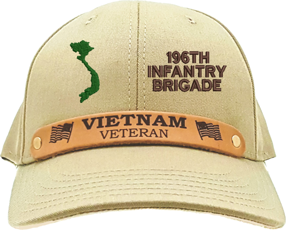 MilitaryBest is proud to offer this Made in the USA 196th Infantry Brigade Vietnam Veteran Leather Strap Cap . The hand crafted leather strap is engraved and attached to a Made in the USA Khaki cap with a hand crafted adjustable leather strap closure in the Missouri Ozarks by a Vietnam Veteran. Once crafted, this Vietnam Veteran hat is proudly embroidered at our facilities in Northeast Alabama. This is a one of a kind cap and we know of no others on the market. Thank you for your service and WELCOME HOME!