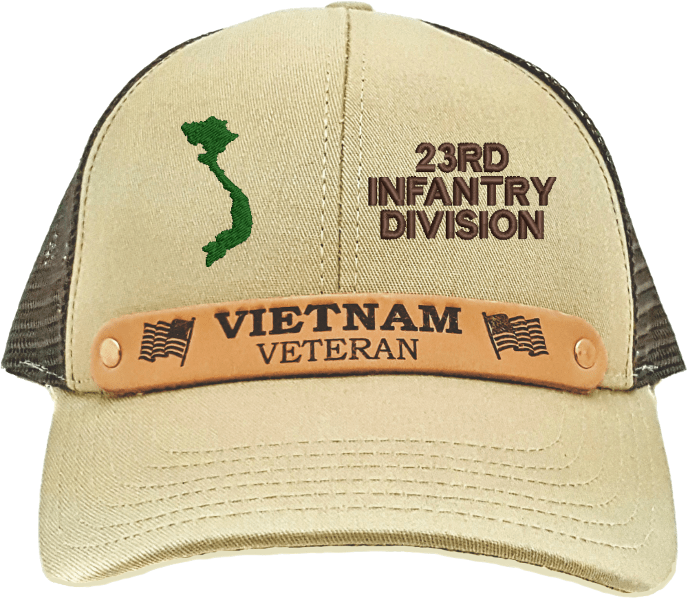 MilitaryBest is proud to offer this fine 23rd Infantry Division Vietnam Veteran Leather Strap Cap. This mesh-back 23rd Infantry Division Vietnam Veteran Leather Strap Cap is made in the USA, and proudly embroidered at our facilities in Scottsboro, AL by skilled craftsmen with a passion for patriotism. Your satisfaction is guaranteed!