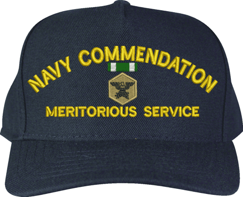 Navy Commendation, Meritorious Service with Medal Custom Embroidered CapMilitaryBest is proud to offer this Navy Commendation, Meritorious Service with Medal Custom Embroidered Cap. The design of this Cap is crisp, clean, and sure to be loved by people of all ages! This Cap is crafted by our skilled embroidery technicians at our facilities in Scottsboro, AL. As with all MilitaryBest items, your satisfaction is guaranteed!