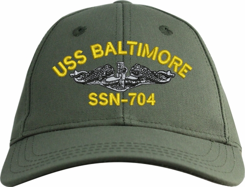 USS Baltimore SSN-704 with Dolphins Custom Embroidered CapMilitaryBest is proud to offer this USS Baltimore SSN-704 with Dolphins Custom Embroidered Cap. The design of this Cap is crisp, clean, and sure to be loved by people of all ages! This Cap is crafted by our skilled embroidery technicians at our facilities in Scottsboro, AL. As with all MilitaryBest items, your satisfaction is guaranteed!