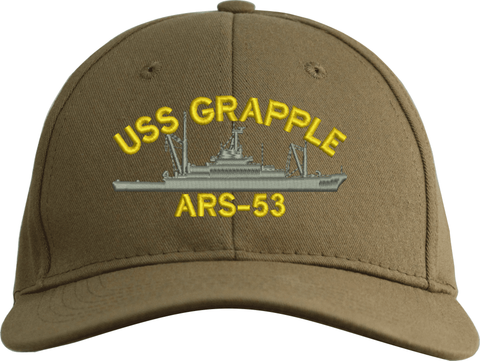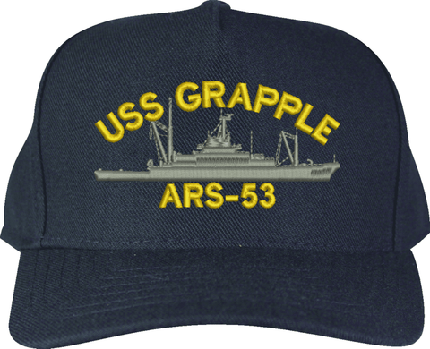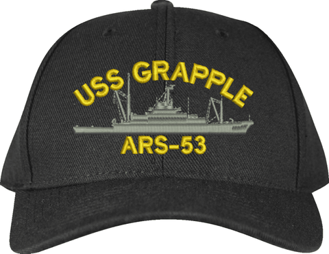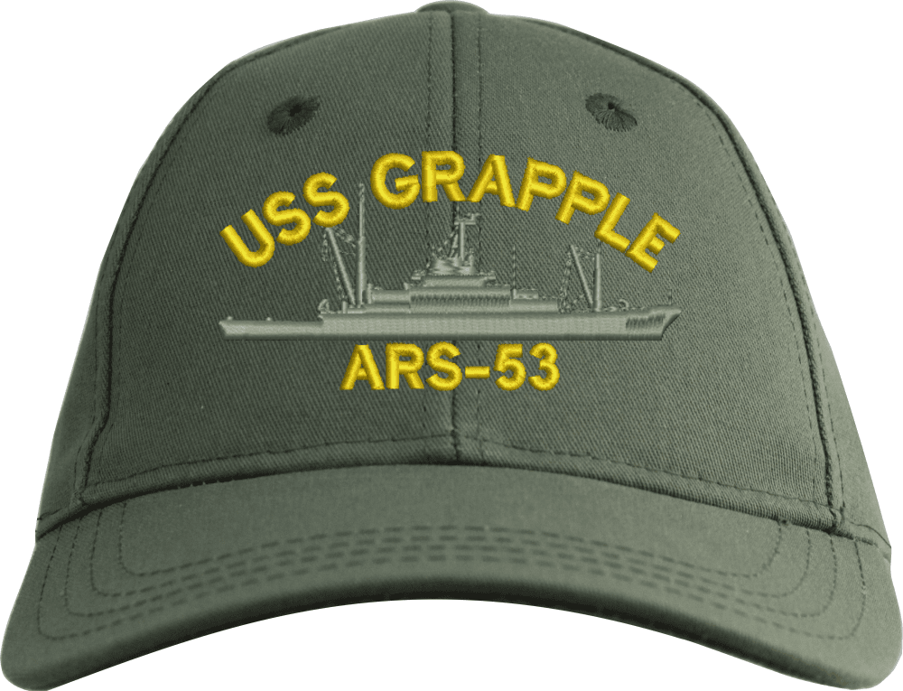 USS Grapple ARS-53 Ship Custom Embroidered CapMilitaryBest is proud to offer this USS Grapple ARS-53 Ship Custom Embroidered Cap. The design of this Cap is crisp, clean, and sure to be loved by people of all ages! This Cap is crafted by our skilled embroidery technicians at our facilities in Scottsboro, AL. As with all MilitaryBest items, your satisfaction is guaranteed!