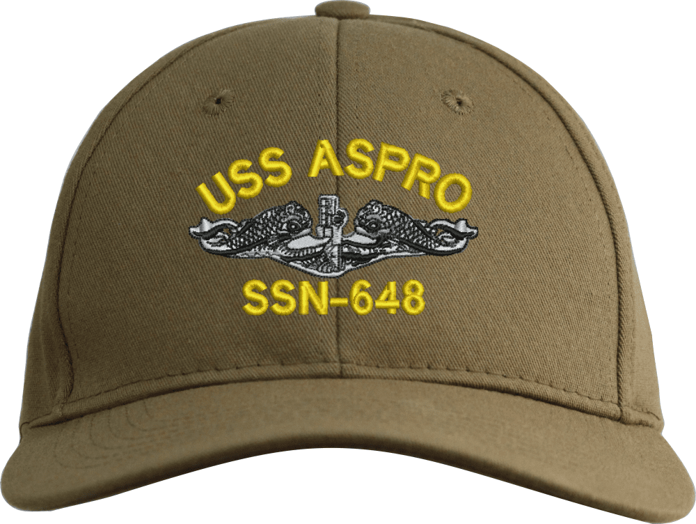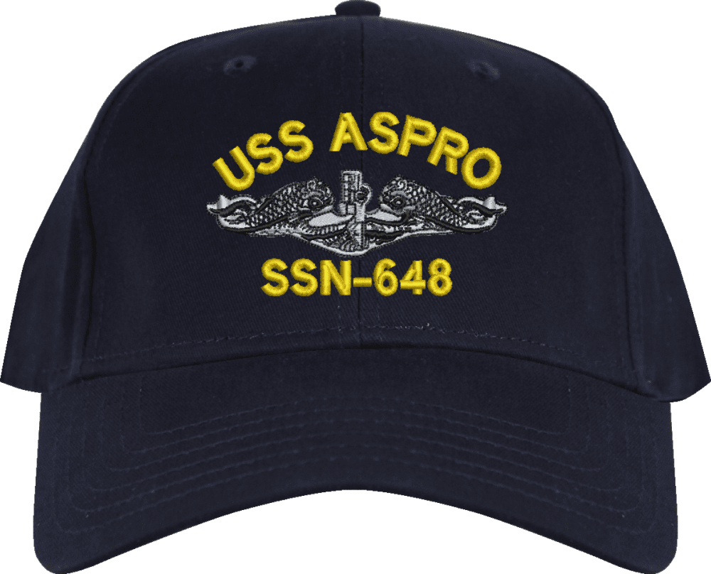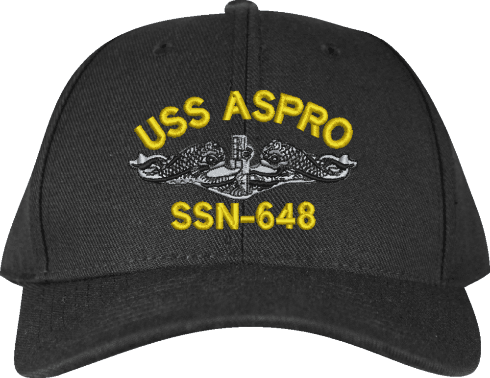 USS Aspro SSN-648 with Dolphins Custom Embroidered CapMilitaryBest is proud to offer this USS Aspro SSN-648 with Dolphins Custom Embroidered Cap. The design of this Cap is crisp, clean, and sure to be loved by people of all ages! This Cap is crafted by our skilled embroidery technicians at our facilities in Scottsboro, AL. As with all MilitaryBest items, your satisfaction is guaranteed!