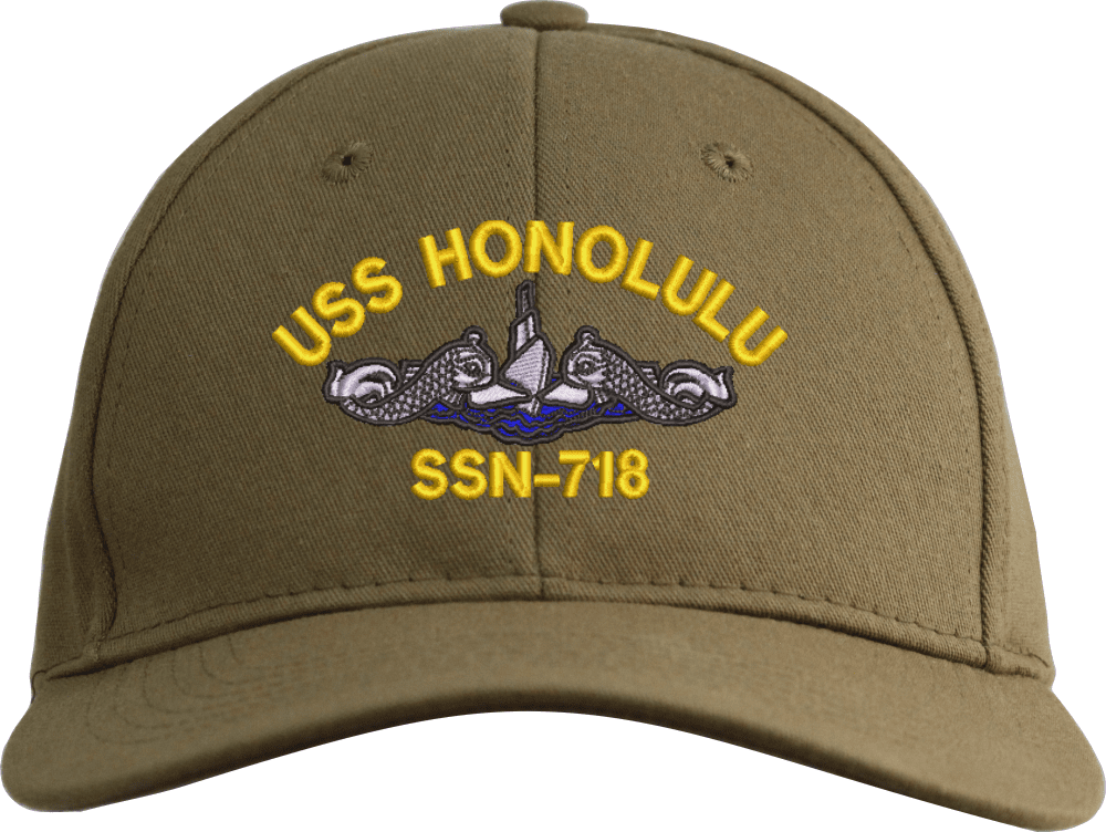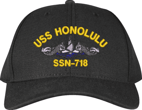 USS Honolulu SSN-718 with Blue Water Dolphins Custom Embroidered CapMilitaryBest is proud to offer this USS Honolulu SSN-718 with Blue Water Dolphins Custom Embroidered Cap. The design of this Cap is crisp, clean, and sure to be loved by people of all ages! This Cap is crafted by our skilled embroidery technicians at our facilities in Scottsboro, AL. As with all MilitaryBest items, your satisfaction is guaranteed!