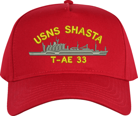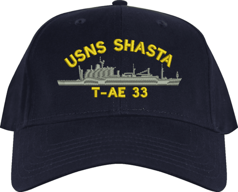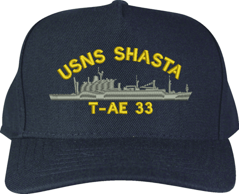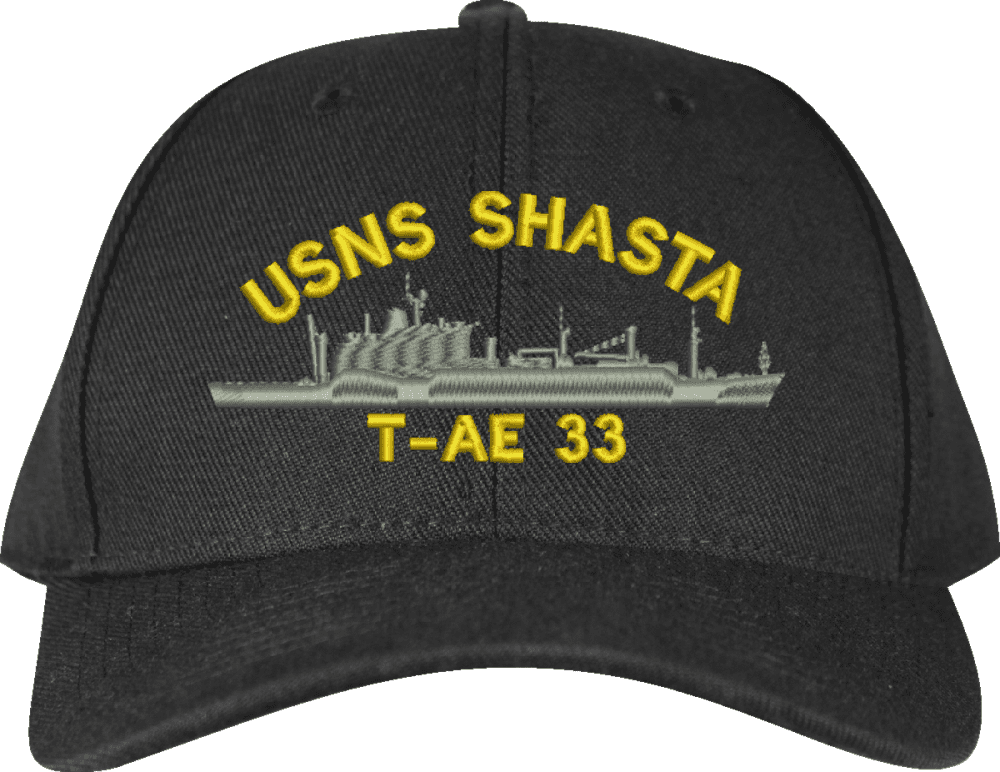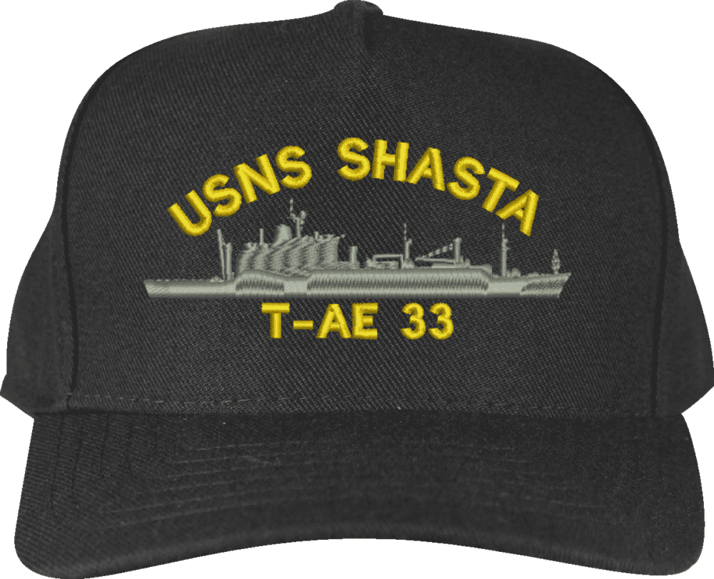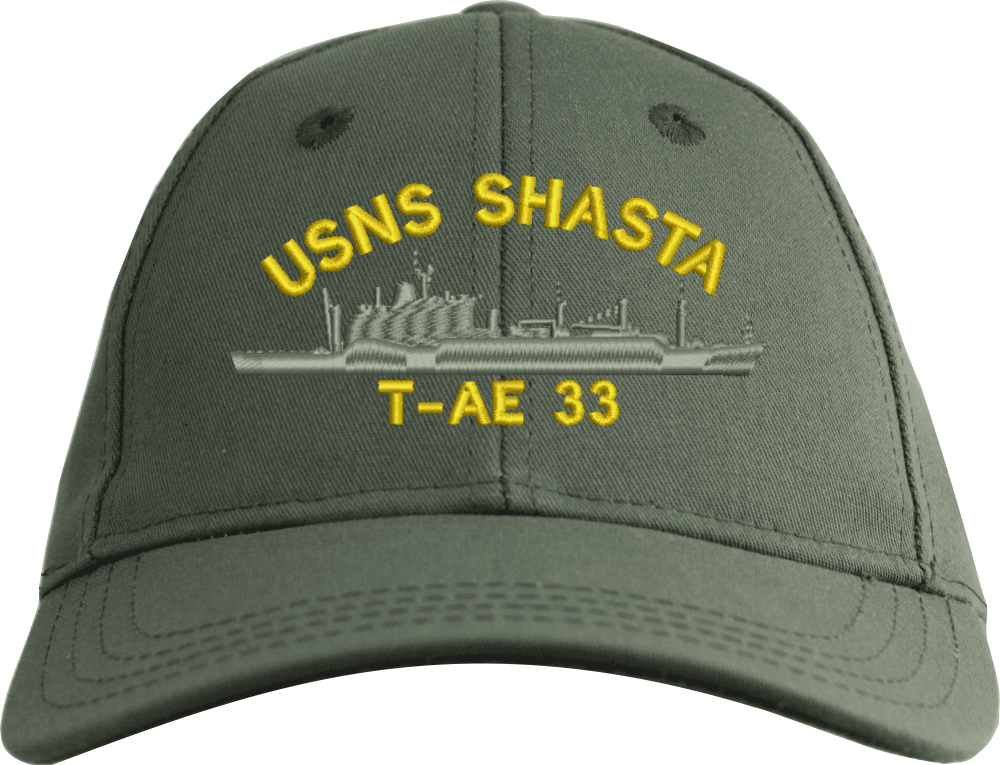 USNS Shasta T-AE-33 Ships Custom Embroidered CapsMilitaryBest is proud to offer this USNS Shasta T-AE-33 Ships Custom Embroidered Caps. The design of this Cap is crisp, clean, and sure to be loved by people of all ages! This Cap is crafted by our skilled embroidery technicians at our facilities in Scottsboro, AL. As with all MilitaryBest items, your satisfaction is guaranteed!