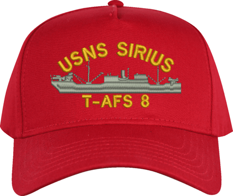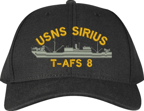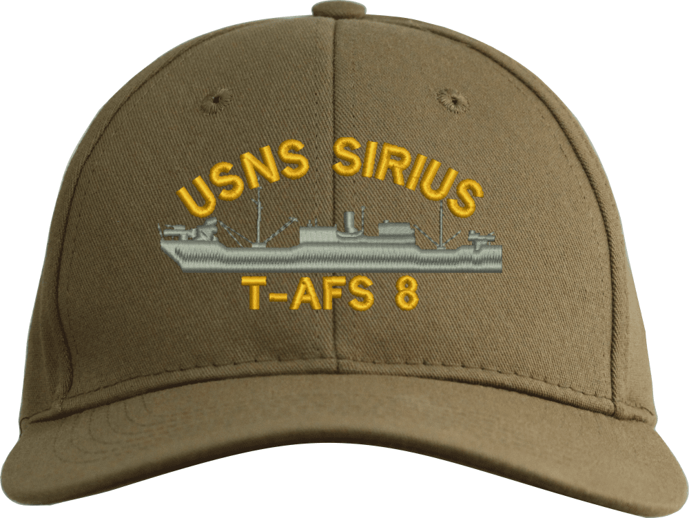 USNS Sirius T-AFS 8 Ship Custom Embroidered CapMilitaryBest is proud to offer this USNS Sirius T-AFS 8 Ship Custom Embroidered Cap. The design of this Cap is crisp, clean, and sure to be loved by people of all ages! This Cap is crafted by our skilled embroidery technicians at our facilities in Scottsboro, AL. As with all MilitaryBest items, your satisfaction is guaranteed!