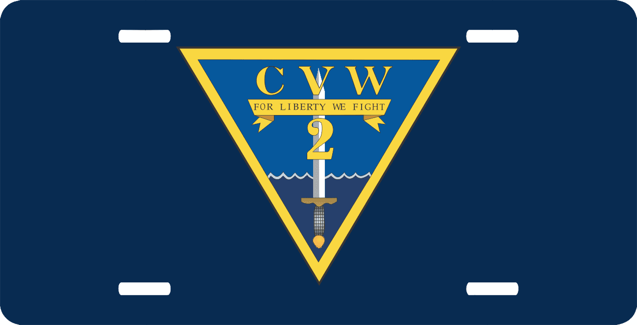This Carrier Air Wing Two CVW2 License Plate is made from heavy gauge aluminum and has a baked enamel finish to last for many years of use. Each plate measures 5 15/16" x 11 15/16". This license plate would make a wonderful addition to your collection or a great gift.