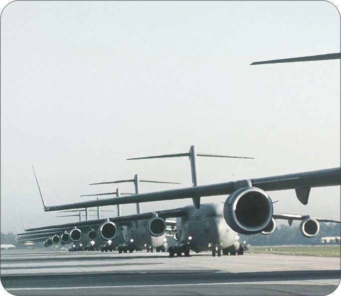 Each of our Air Force Collection mouse pads are proudly made in the USA at our Jacksonville, Florida facilities with sharp, colorful graphics. The pads measure 9" in width by 7 3/4" in height and are 1/4" thick.This C-17 Moose Walk mouse pad showcases In a classic "Moose Walk", a C-17 from the 437th Airlift Wing lines up on the taxiway at Charleston Air Force Base, before taking to the air for a nine-ship, close-formation airdrop. The largest formation of C-17s from a single base took off from Charleston Air Force Base in a demonstration of the strategic airdrop capability of the Air Force. Flying in the formation was Col. Glen Joerger, the 437th Airlift Wing commander, as the Team Charleston aircrews are conducting this training to remain proficient. Charleston aircrews fly daily missions around the world supporting the Global War on Terrorism.