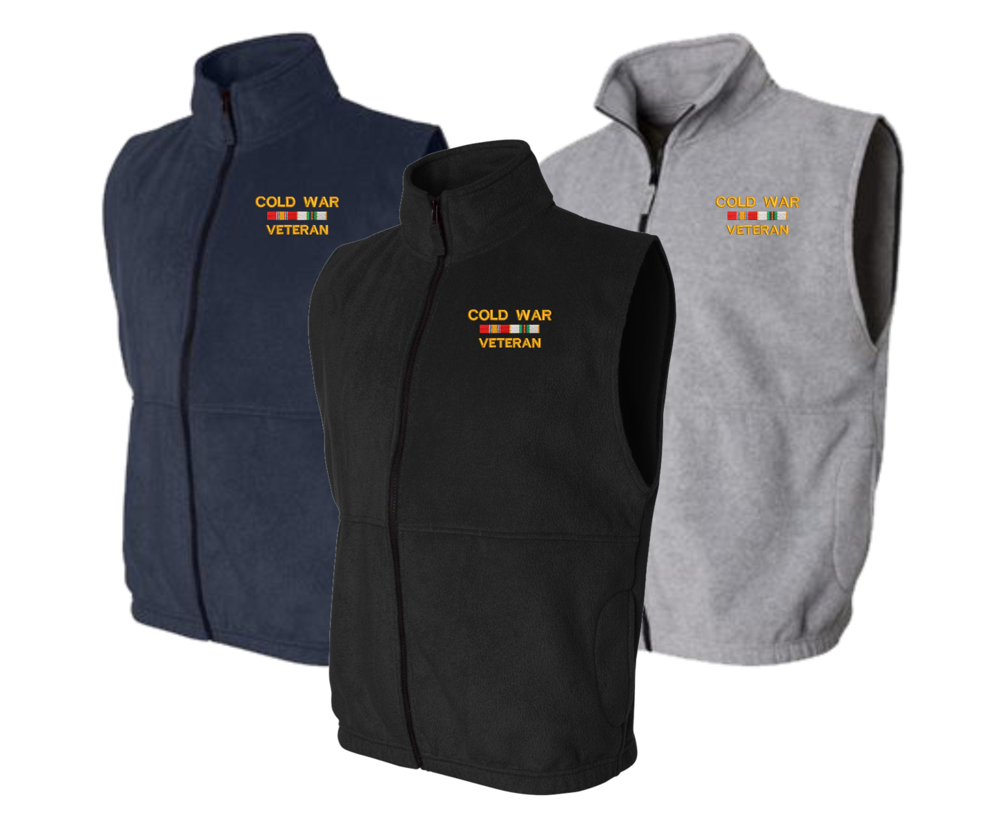 Due to supply chain disruptions, some colors and sizes may not be available in the same Brand, in these cases a brand of comparable quality will be used. Feel free to call in advance of your order, with questions you may have.MilitaryBest is expanding it's line of Men's apparel with this quality Cold War Veteran Full-Zip Fleece Vest. This Full-Zip Fleece Vests feature a convertible collar with dyed-to-match zipper pull, oversized nylon reinforced slash pockets, and an elastic hem. They are made out of 100% anti-pill polyester. This vest will make an excellent addition to your wardrobe, or a quality gift. Your satisfaction is guaranteed! All embroidery is done at our facilities in Scottsboro, AL.