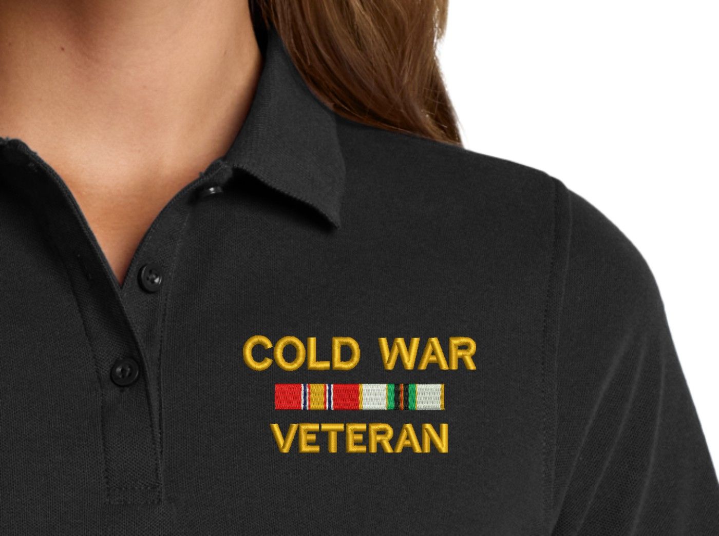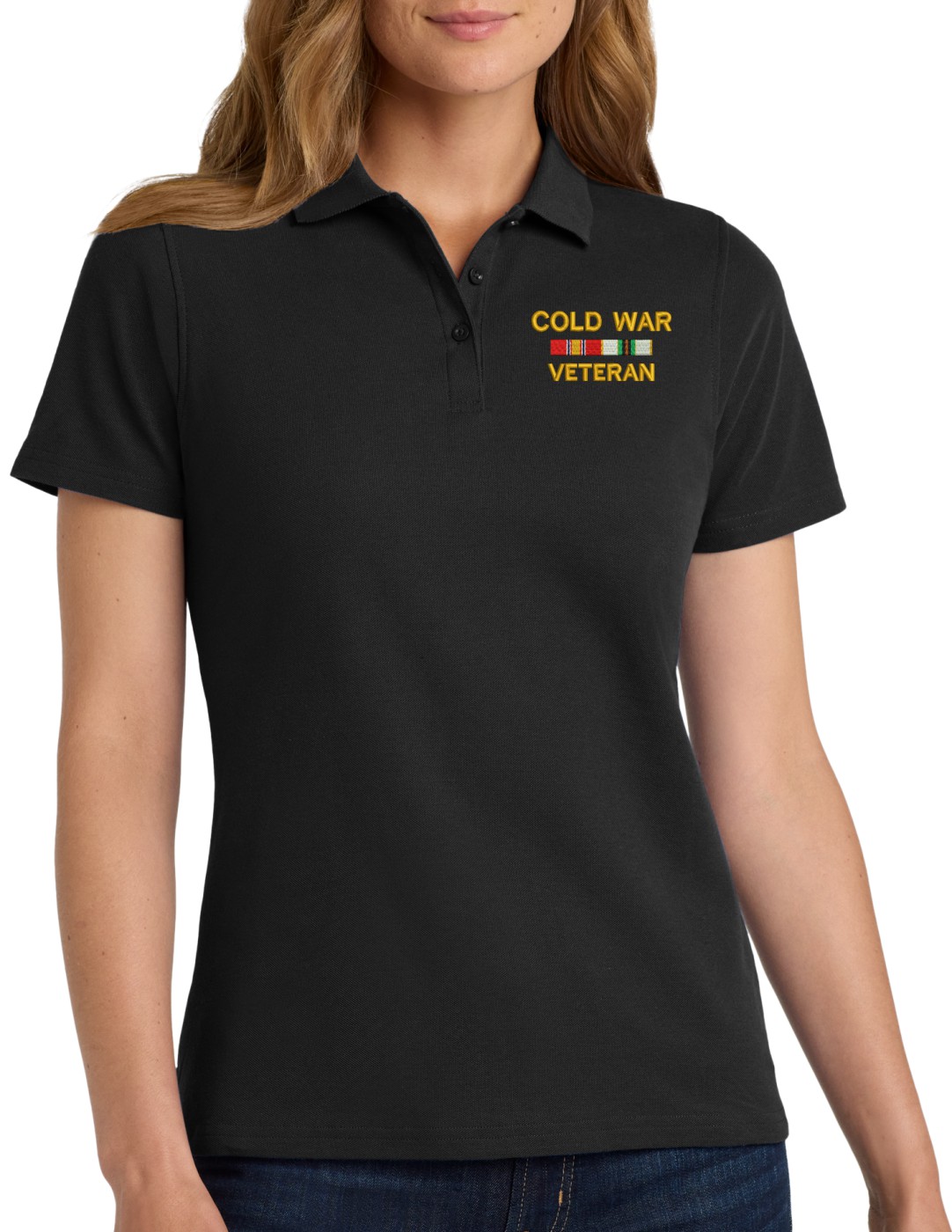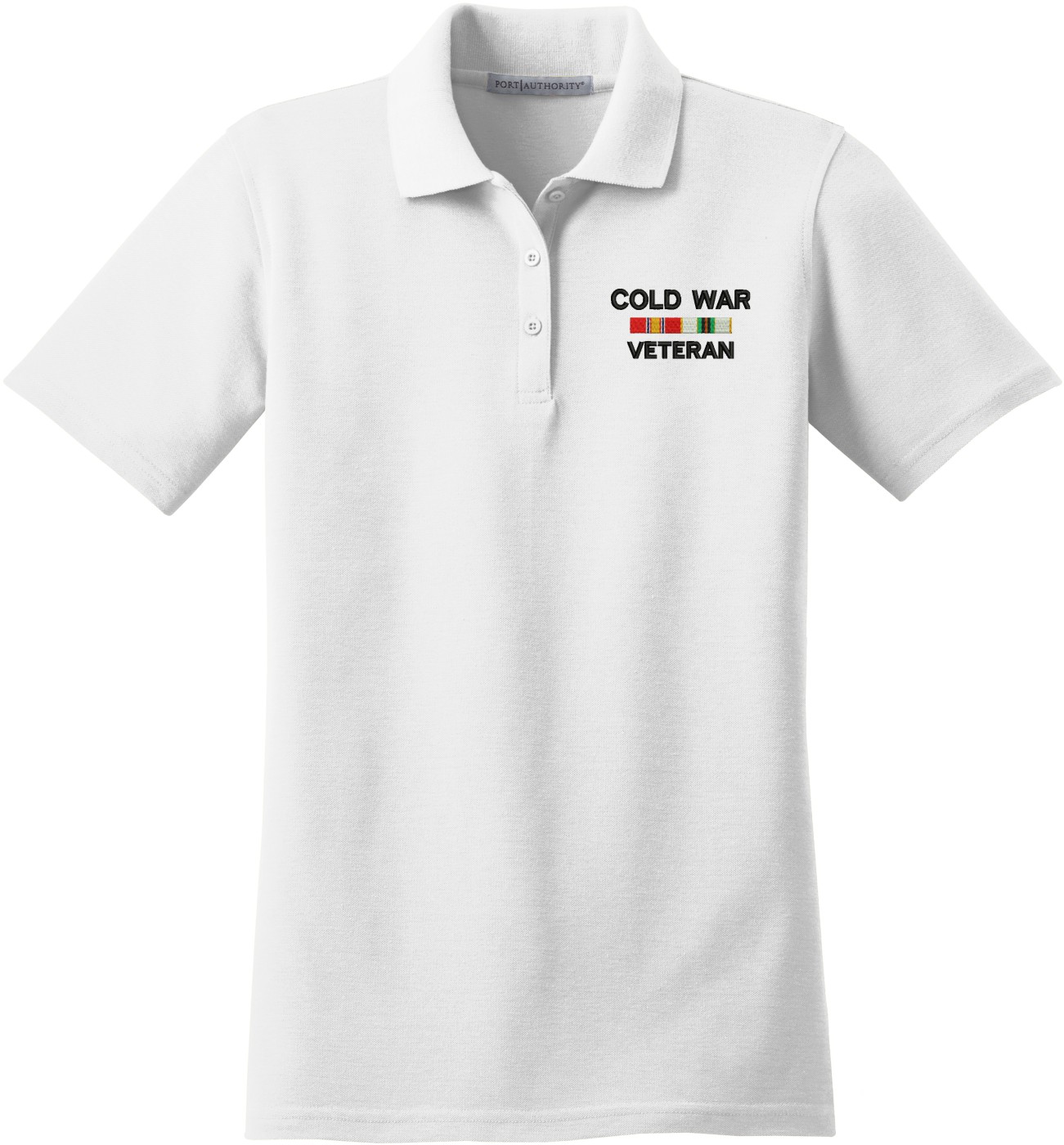 MilitaryBest is proud to offer this Cold War Veteran with Service Ribbons Women's Stain-Release Polo. This polo is embroidered by our MilitaryBest team in Northeast Alabama. These polos are made with a stain-release finish for long-lasting wear, odor-fighting properties, and superior wrinkle and shrink resistance.Care Instructions: Machine Wash Cold With Like Colors. Do Not Use Fabric Softener. Do Not Bleach. Tumble Dry Low. Warm Iron If Necessary.