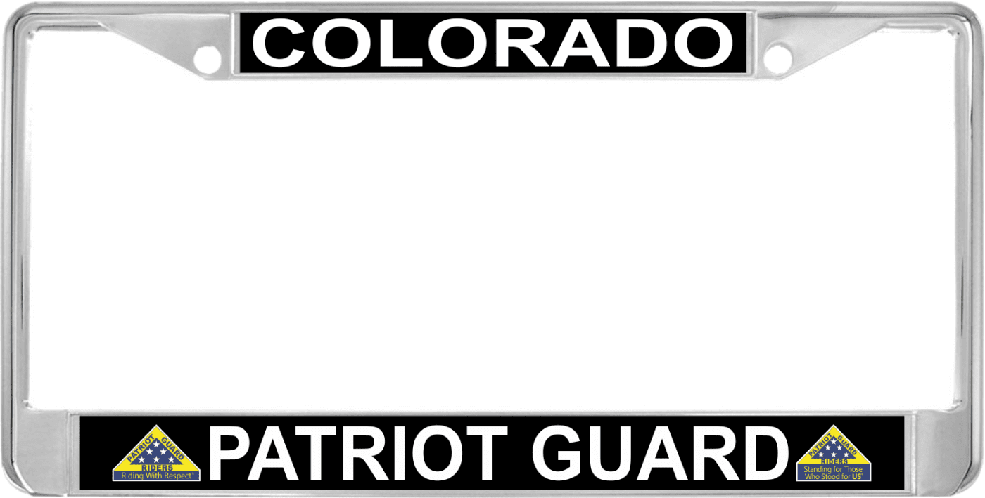 This Colorado Patriot Guard Automobile License Plate Frame is proudly produced at our facility in Scottsboro, Alabama. Each Chrome Dipped Alloy Frame has Poly Coated Aluminum Inserts which allow our production team to provide you with High Quality Designs. Unfortunately, this frame is not offered as a Motorcycle Frame.Please check with your state and local regulations regarding suitability for displaying this Automobile License Plate Frame on your vehicle since these regulations may have changed in your state. Various weather and road conditions may impact the life span of your frame e.g. salted roads, long exposure to direct sunlight etc.