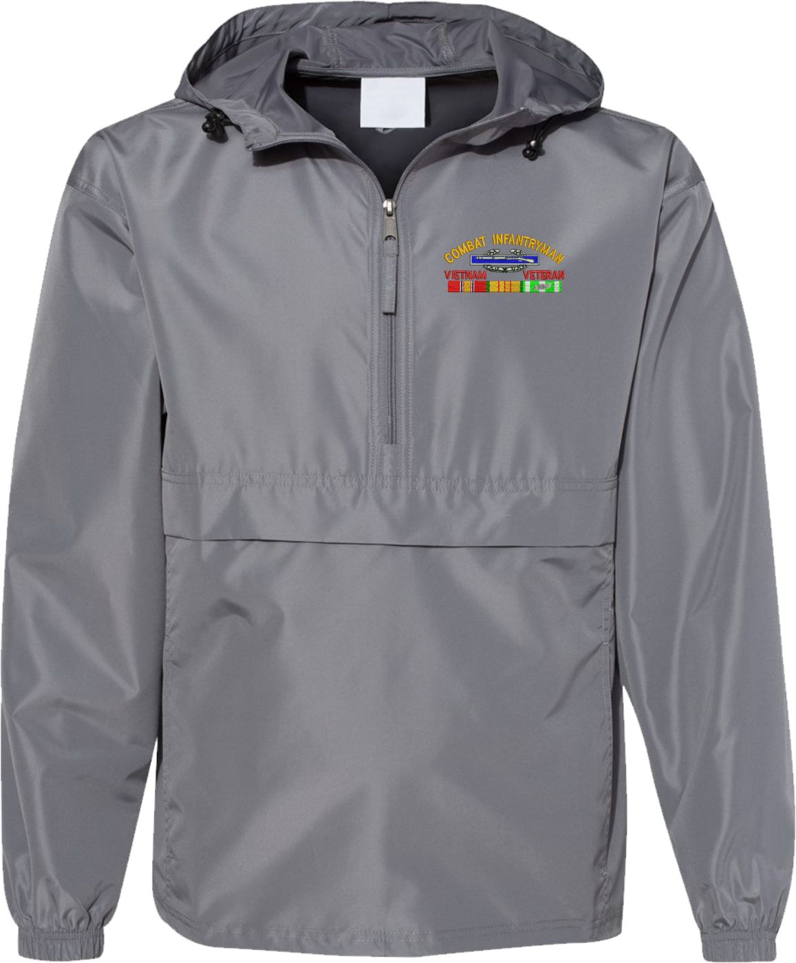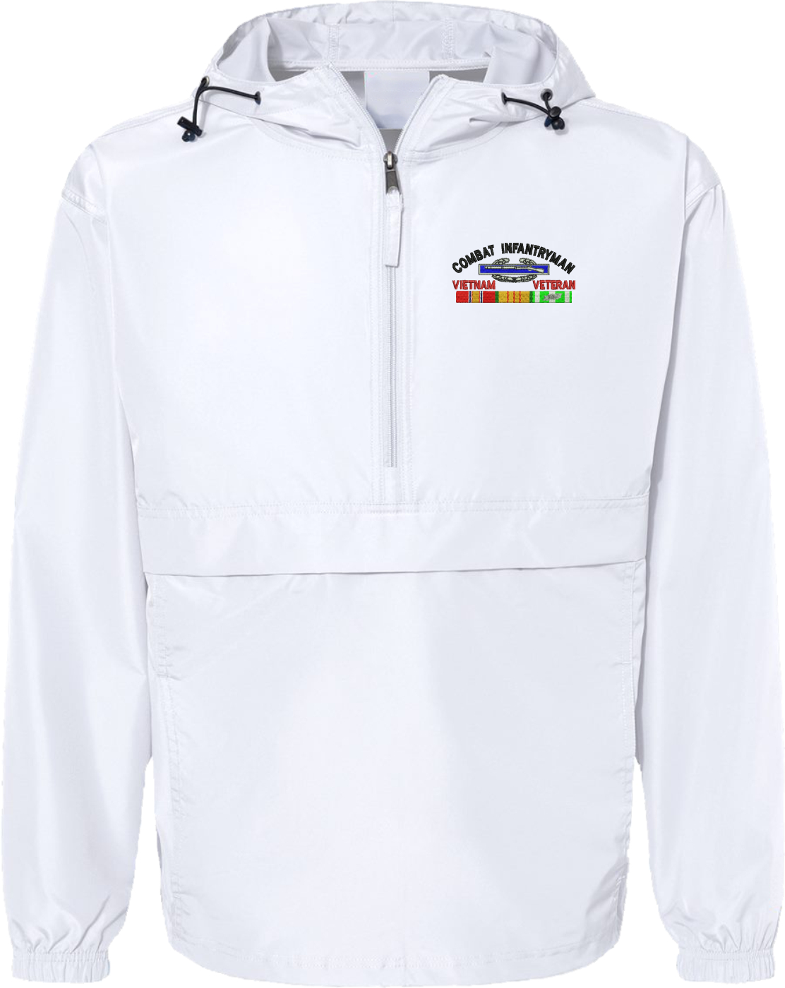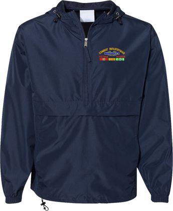 MilitaryBest is proud to offer this quality Combat Infantryman Vietnam Veteran with Ribbons Hooded Windbreaker. Also known as an Anorak Jacket, this windbreaker is designed to keep wind and water out. With a design embroidered over the left chest, this windbreaker is embroidered to order at our facilities in Scottsboro, AL.. This windbreaker can be packed into the mesh lined pouch pocket for a more portable method of storage.- 100% Polyester