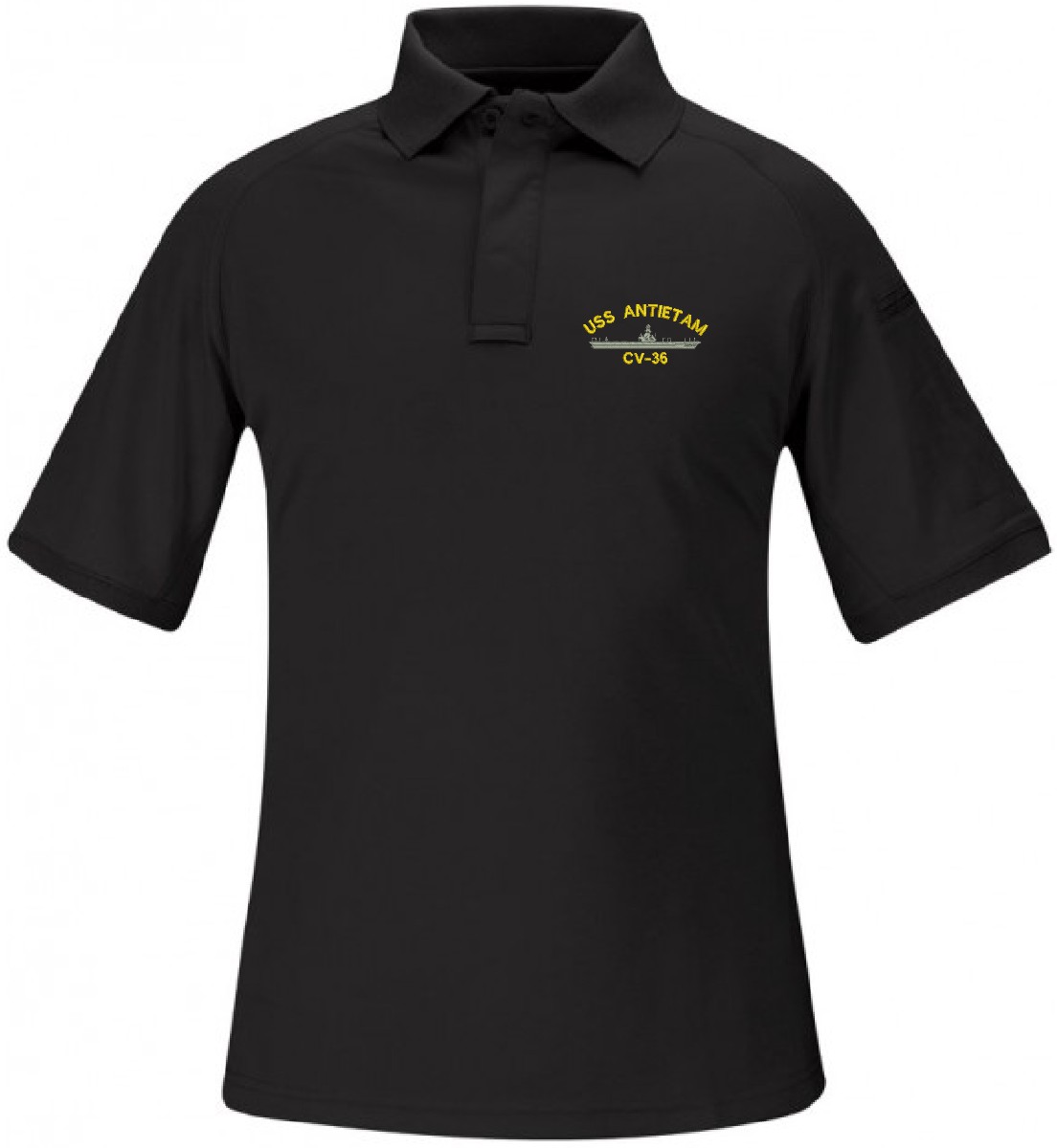 MilitaryBest is proud to offer this USS Antietam CV-36 Propper Brand Snag Free Polo Shirt. These polos are Moisture Wicking with a knit so tight that the shirt will not snag. This Polo honors the service of our U.S. Navy personel who have served aboard this ship protecting our freedom with pride. Choose from Black, Navy Blue, and White in Sizes Small - 5XL. These are perfect for honoring your USS Antietam Navy Veteran. For an additional cost you can also have your Rank & Rate embroidered on the left sleeve of the Polo. All embroidery is performed to order at our facilities in Scottsboro, Alabama by Americans with a passion for patriotism!