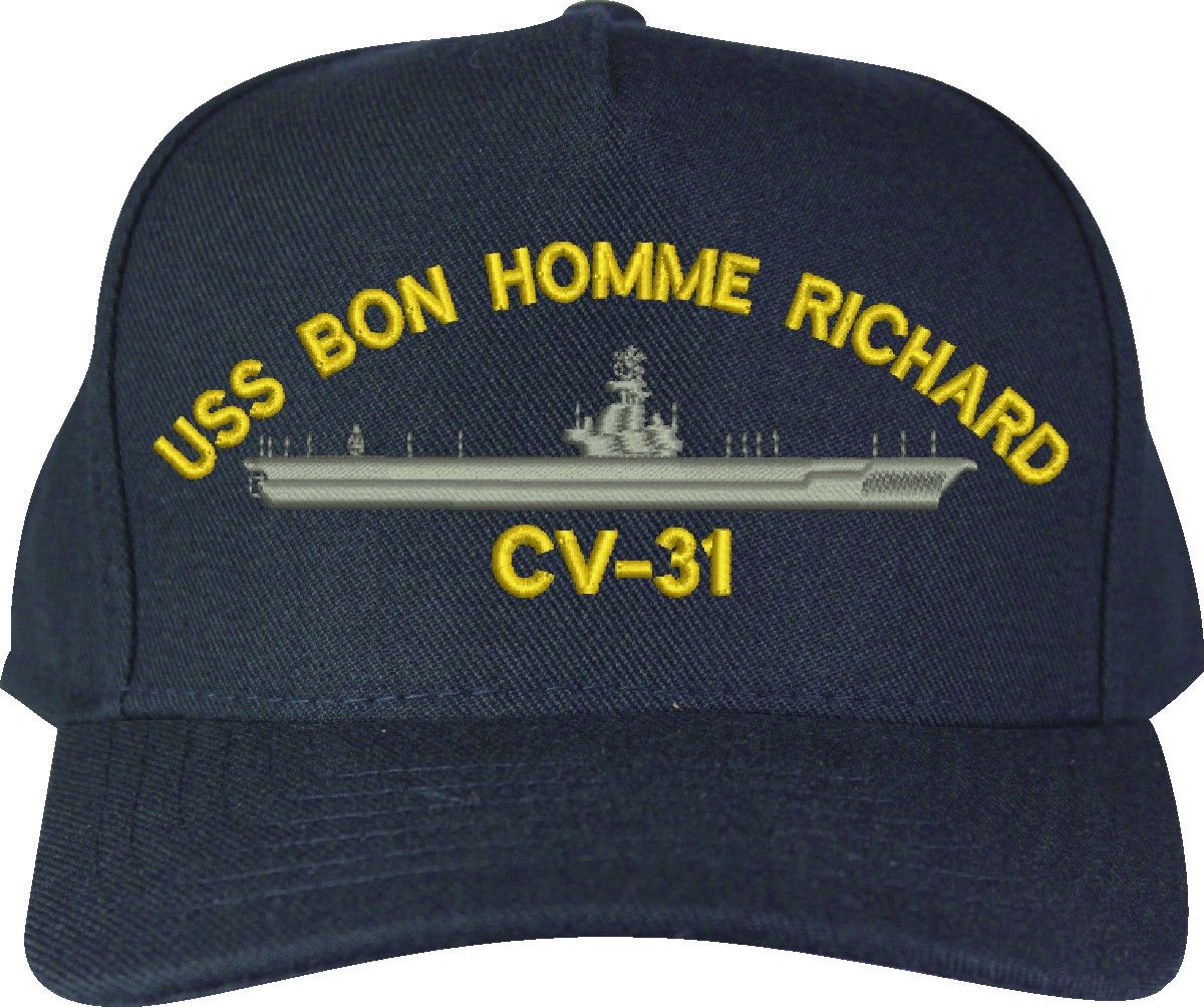 MilitaryBest is proud to offer this USS Bon Homme Richard CV-31 Made in the USA Ball Cap. This Cap honors the service of our U.S. Navy personel who have served aboard this ship protecting our freedom with pride. Choose from Navy Blue or Black in High or Low Profile. These are perfect for honoring your USS Bon Homme Richard Navy Veteran. For an additional cost you can also have your Custom Text embroidered on the back of the ball cap. Embroidery on these Made in the USA caps is performed to order at our facilities in Scottsboro, Alabama by Americans with a passion for patriotism!