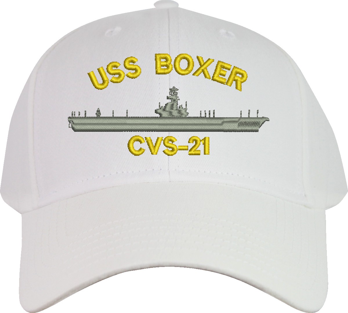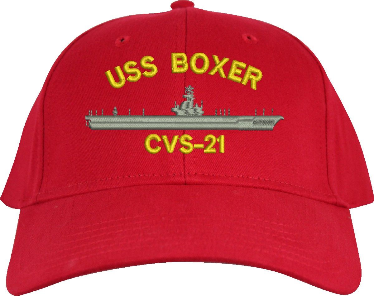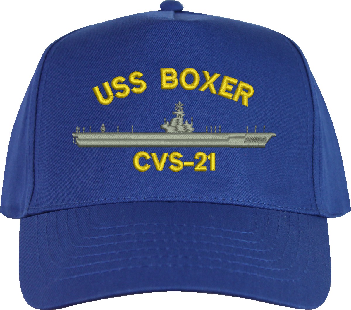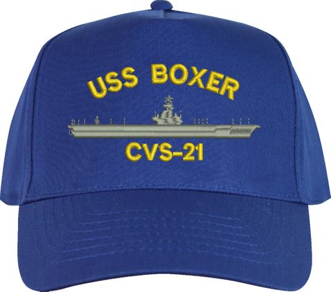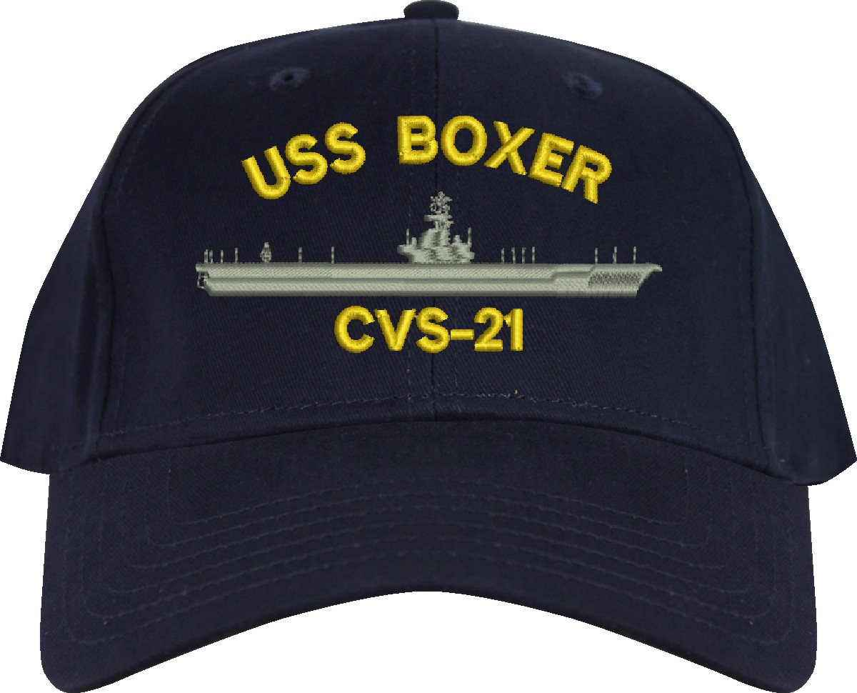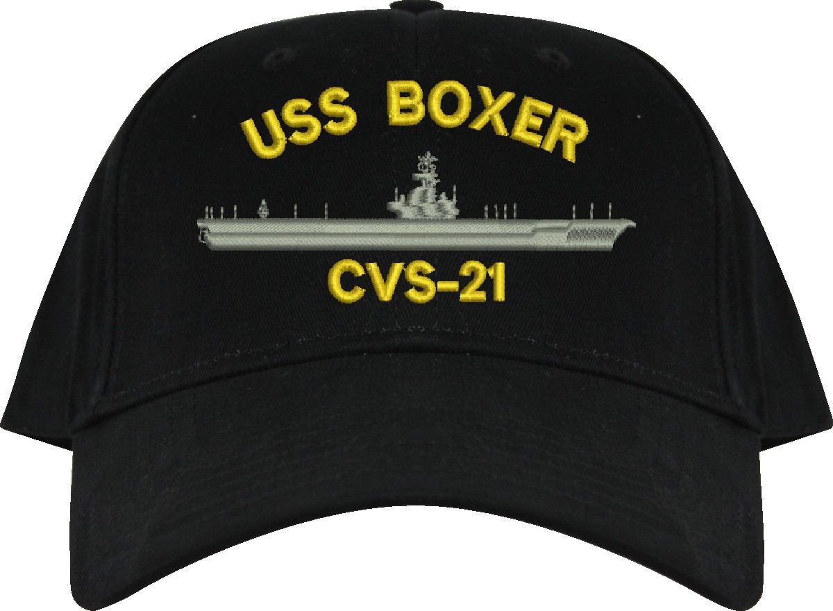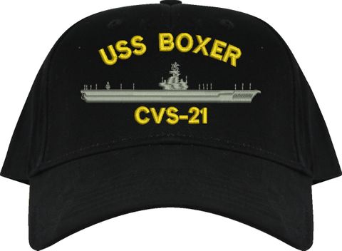 All Text on custom orders will be embroidered in ALL CAPITAL LETTERS.MilitaryBest is proud to offer this USS Boxer CVS-21 Imported Cap. This Cap honors the service of our U.S. Navy personel who have served aboard this ship protecting our freedom with pride. Choose from an assortment of colors in High or Low Profile. These are perfect for honoring your USS Boxer Navy Veteran. For an additional cost you can also have your Custom Text embroidered on the back of the ball cap. All embroidery is performed to order at our facilities in Scottsboro, Alabama by Americans with a passion for patriotism!