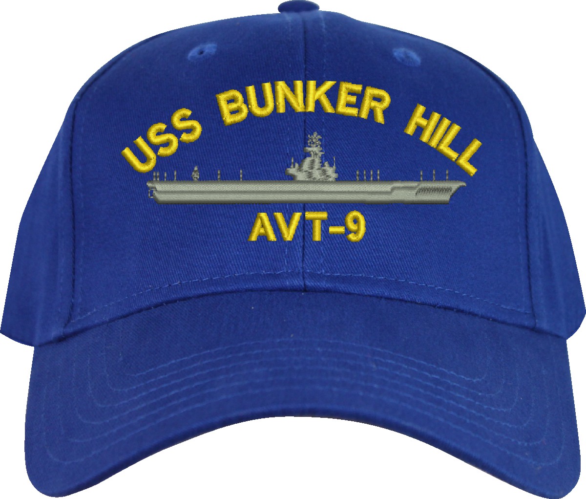 All Text on custom orders will be embroidered in ALL CAPITAL LETTERS.MilitaryBest is proud to offer this USS Bunker Hill AVT-9 Imported Cap. This Cap honors the service of our U.S. Navy personel who have served aboard this ship protecting our freedom with pride. Choose from an assortment of colors in High or Low Profile. These are perfect for honoring your USS Bunker Hill Navy Veteran. For an additional cost you can also have your Custom Text embroidered on the back of the ball cap. All embroidery is performed to order at our facilities in Scottsboro, Alabama by Americans with a passion for patriotism!