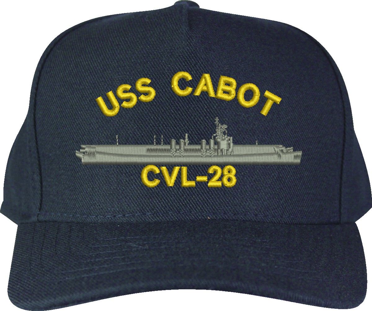 MilitaryBest is proud to offer this USS Cabot CVL-28 Made in the USA Ball Cap. This Cap honors the service of our U.S. Navy personel who have served aboard this ship protecting our freedom with pride. Choose from Navy Blue or Black in High or Low Profile. These are perfect for honoring your USS Cabot Navy Veteran. For an additional cost you can also have your Custom Text embroidered on the back of the ball cap. Embroidery on these Made in the USA caps is performed to order at our facilities in Scottsboro, Alabama by Americans with a passion for patriotism!