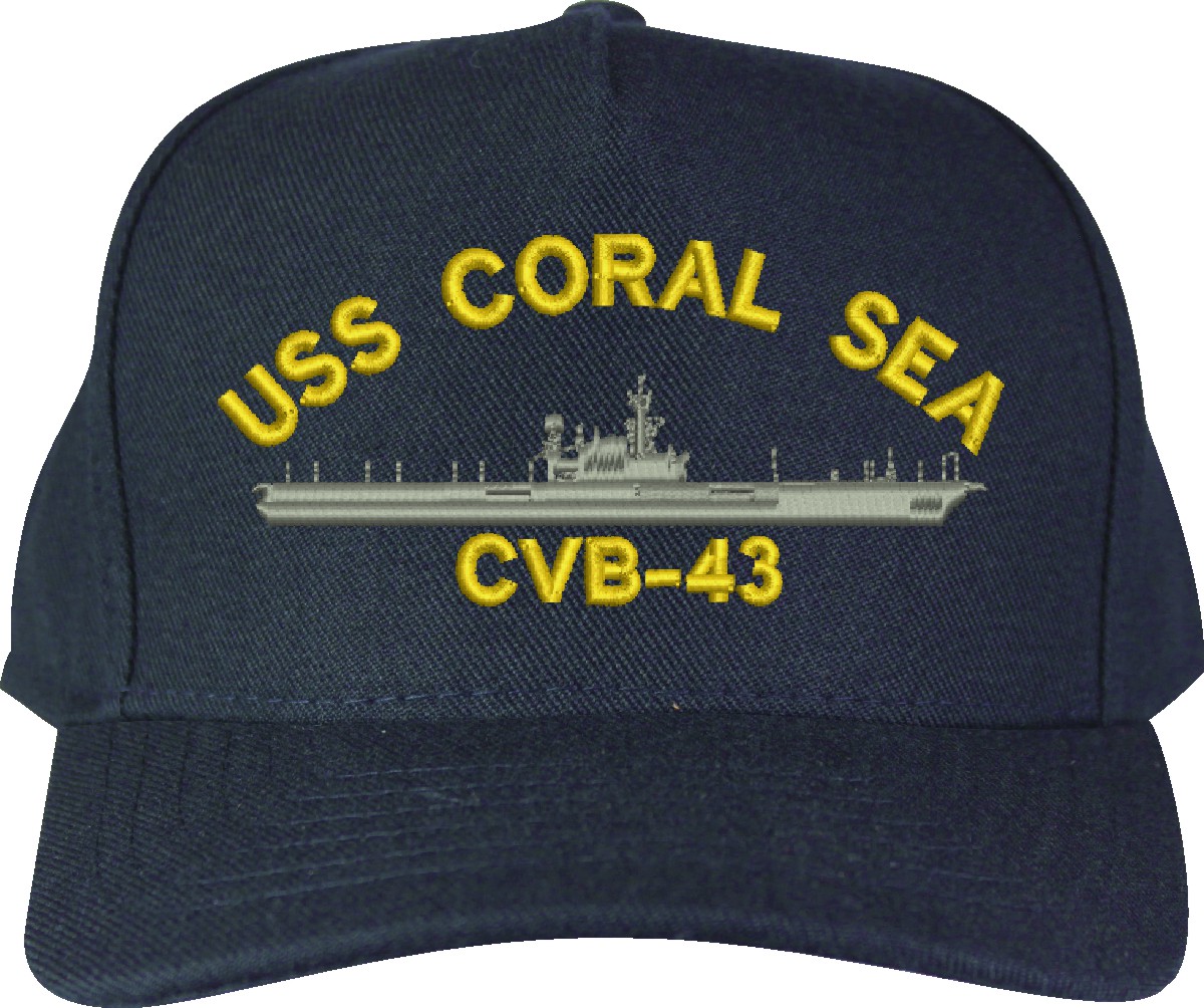MilitaryBest is proud to offer this USS Coral Sea CVB-43 Made in the USA Ball Cap. This Cap honors the service of our U.S. Navy personel who have served aboard this ship protecting our freedom with pride. Choose from Navy Blue or Black in High or Low Profile. These are perfect for honoring your USS Coral Sea Navy Veteran. For an additional cost you can also have your Custom Text embroidered on the back of the ball cap. Embroidery on these Made in the USA caps is performed to order at our facilities in Scottsboro, Alabama by Americans with a passion for patriotism!