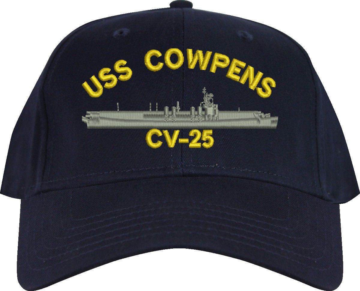 All Text on custom orders will be embroidered in ALL CAPITAL LETTERS.MilitaryBest is proud to offer this USS Cowpens CV-25 Imported Cap. This Cap honors the service of our U.S. Navy personel who have served aboard this ship protecting our freedom with pride. Choose from an assortment of colors in High or Low Profile. These are perfect for honoring your USS Cowpens Navy Veteran. For an additional cost you can also have your Custom Text embroidered on the back of the ball cap. All embroidery is performed to order at our facilities in Scottsboro, Alabama by Americans with a passion for patriotism!