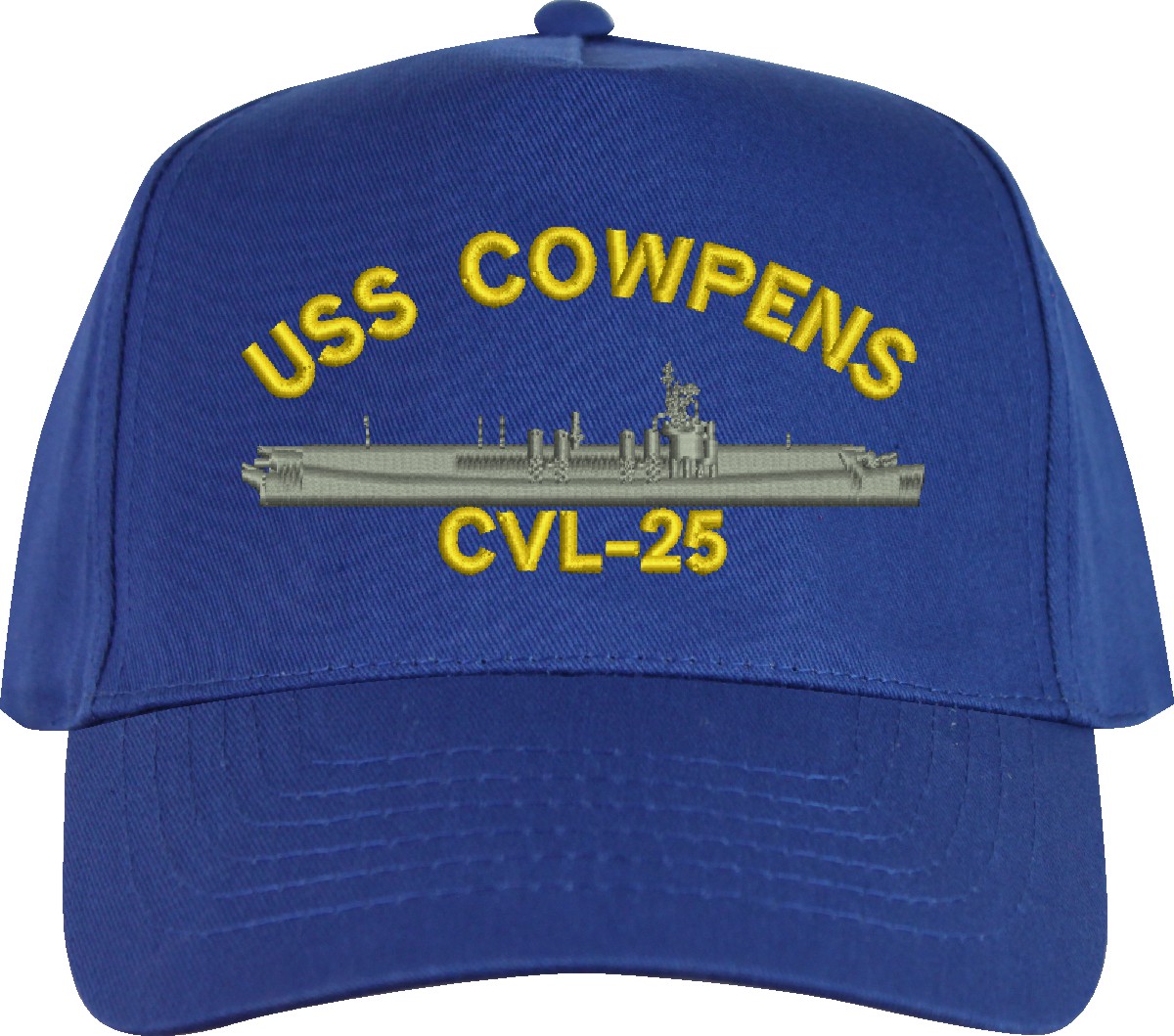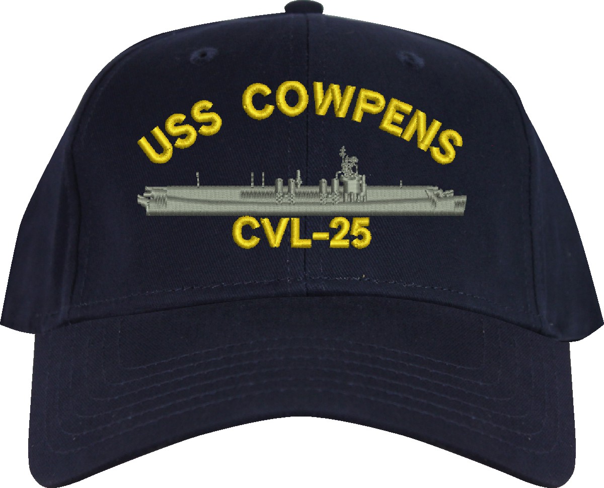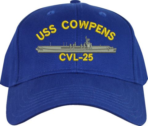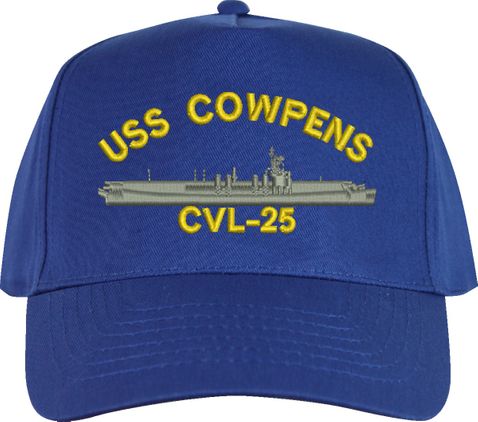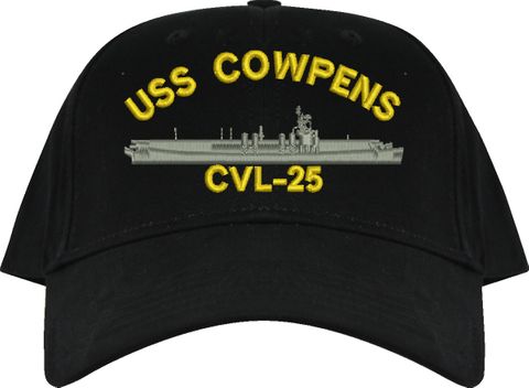 All Text on custom orders will be embroidered in ALL CAPITAL LETTERS.MilitaryBest is proud to offer this USS Cowpens CVL-25 Imported Cap. This Cap honors the service of our U.S. Navy personel who have served aboard this ship protecting our freedom with pride. Choose from an assortment of colors in High or Low Profile. These are perfect for honoring your USS Cowpens Navy Veteran. For an additional cost you can also have your Custom Text embroidered on the back of the ball cap. All embroidery is performed to order at our facilities in Scottsboro, Alabama by Americans with a passion for patriotism!