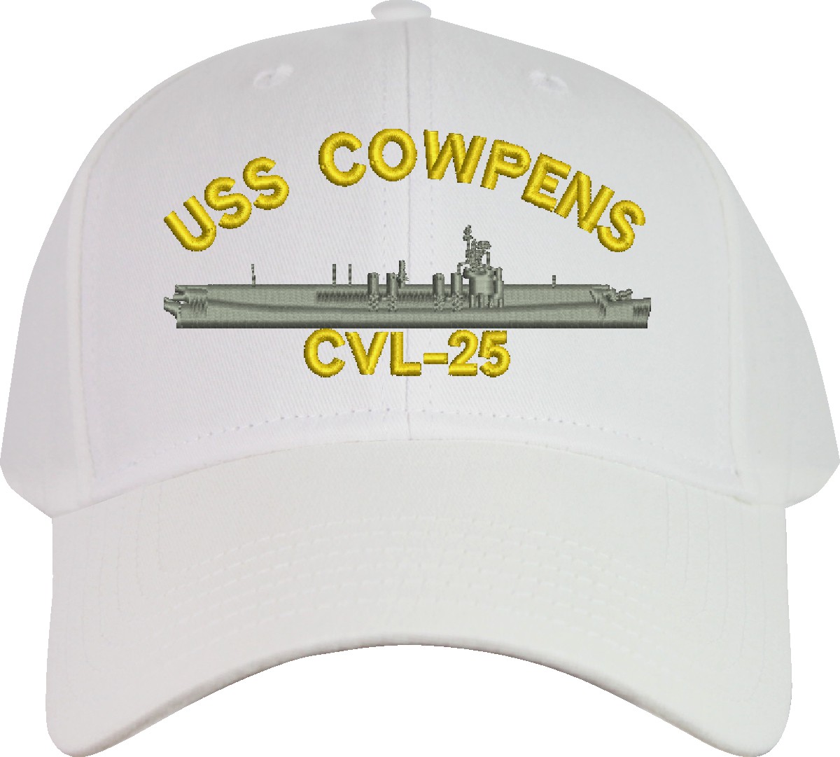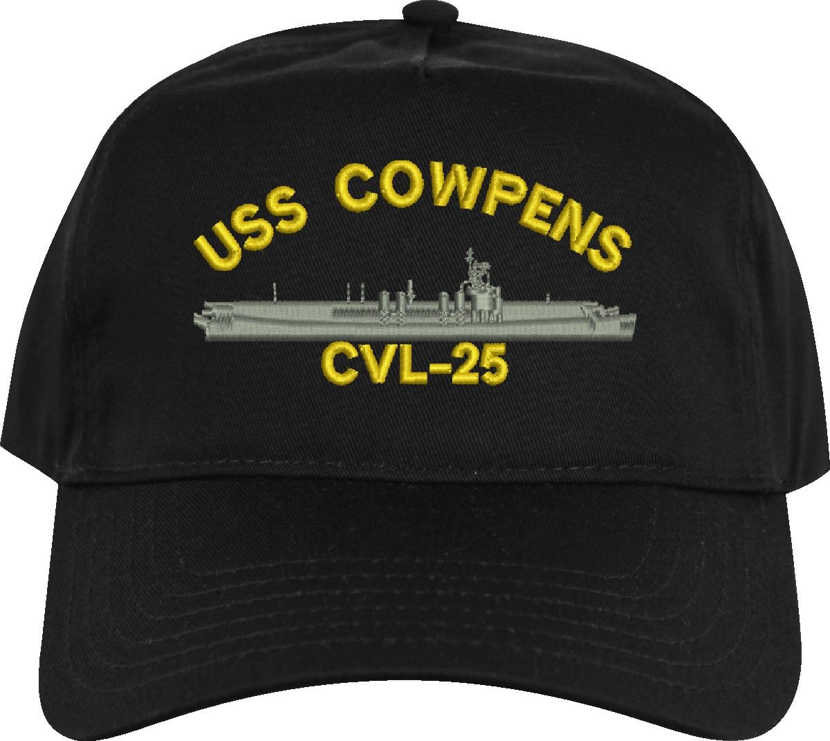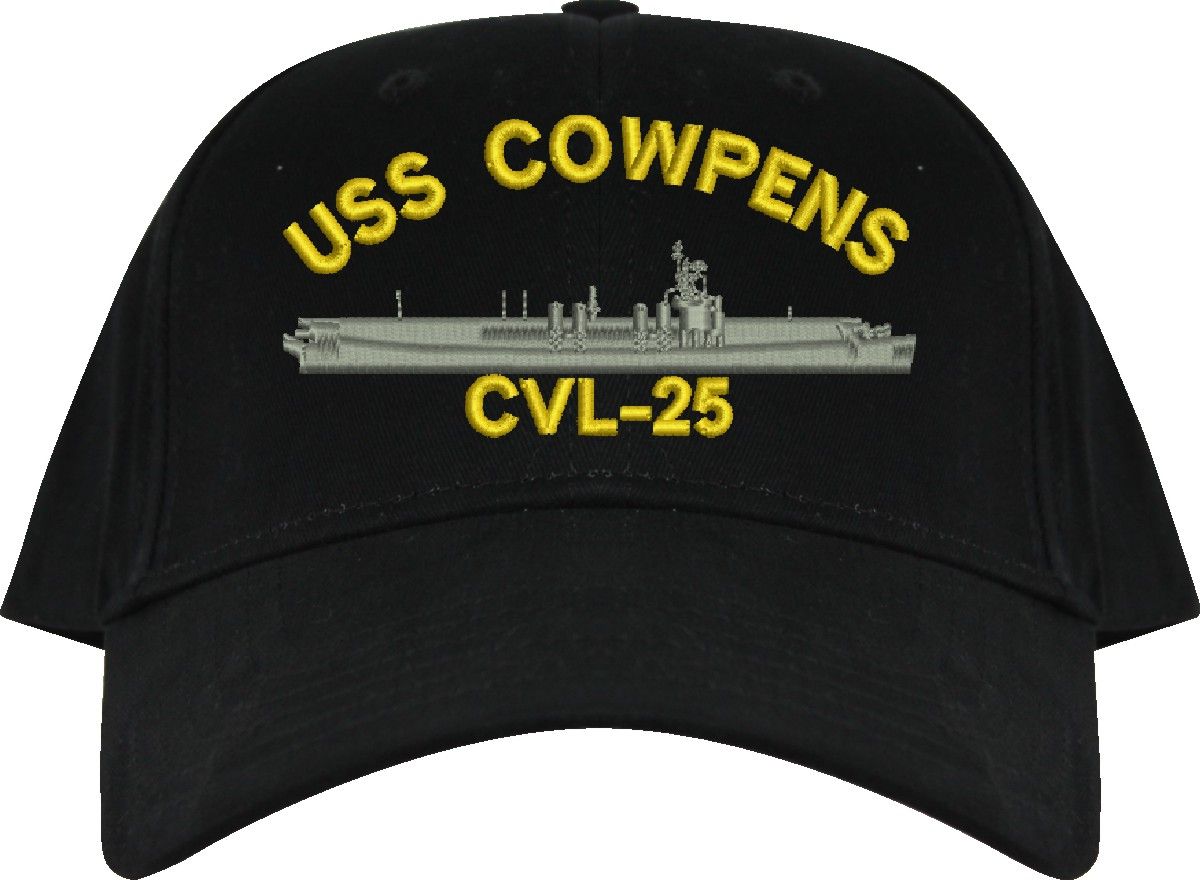 All Text on custom orders will be embroidered in ALL CAPITAL LETTERS.MilitaryBest is proud to offer this USS Cowpens CVL-25 Imported Cap. This Cap honors the service of our U.S. Navy personel who have served aboard this ship protecting our freedom with pride. Choose from an assortment of colors in High or Low Profile. These are perfect for honoring your USS Cowpens Navy Veteran. For an additional cost you can also have your Custom Text embroidered on the back of the ball cap. All embroidery is performed to order at our facilities in Scottsboro, Alabama by Americans with a passion for patriotism!
