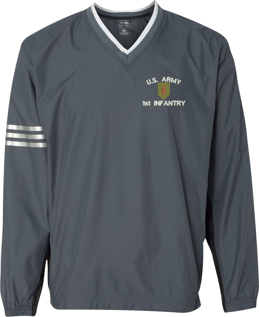 All Text on custom orders will be embroidered in ALL CAPITAL LETTERS.Each of our Army Custom Adidas Windshirts is embroidered at our facilities in Scottsboro, AL. Choose from a variety of U.S. Army insignia with custom text above and below. We use white thread for the text on these windshirts to match the Adidas Logo stripes on the sleeves. These "windbreakers" also come with pockets and resist both wind and water.