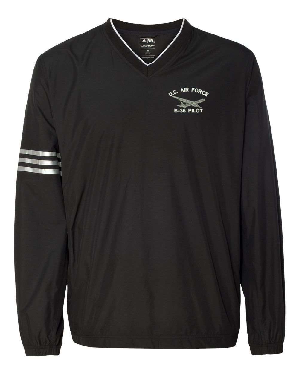 All Text on custom orders will be embroidered in ALL CAPITAL LETTERS.Each of our Military Aircraft Custom Adidas Windshirts is embroidered at our facilities in Scottsboro, AL. Choose from a variety of U.S. Military Aircraft with custom text above and below. We use white thread for the text on these windshirts to match the Adidas Logo stripes on the sleeves. These "windbreakers" also come with pockets and resist both wind and water.