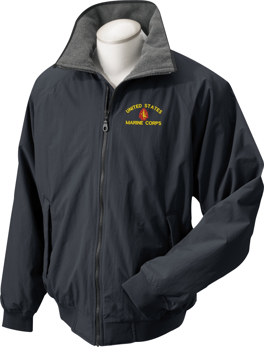 Note: Some of the Color Options pictured may not be available. Available Color Options are listed on the drop down menu above.All Text on custom orders will be embroidered in ALL CAPITAL LETTERS.MilitaryBest is expanding it's line of Men's and Women's apparel with this quality Custom Embroidered Marine Corps Jacket. This jacket is made from a 3-Layer system consisting of a nylon shell, an insulator layer, Nylon-lined sleeves, and an inside layer of fleece for comfort. The jacket features include a sturdy black enamel front-zipper, raglan sleeves, outsize zip pockets, an inside zip security pocket, YKK zippers, and a banded-bottom. This jacket will make an excellent addition to your wardrobe, or a quality gift. Your satisfaction is guaranteed! All embroidery is done at our facilities in Scottsboro, AL.