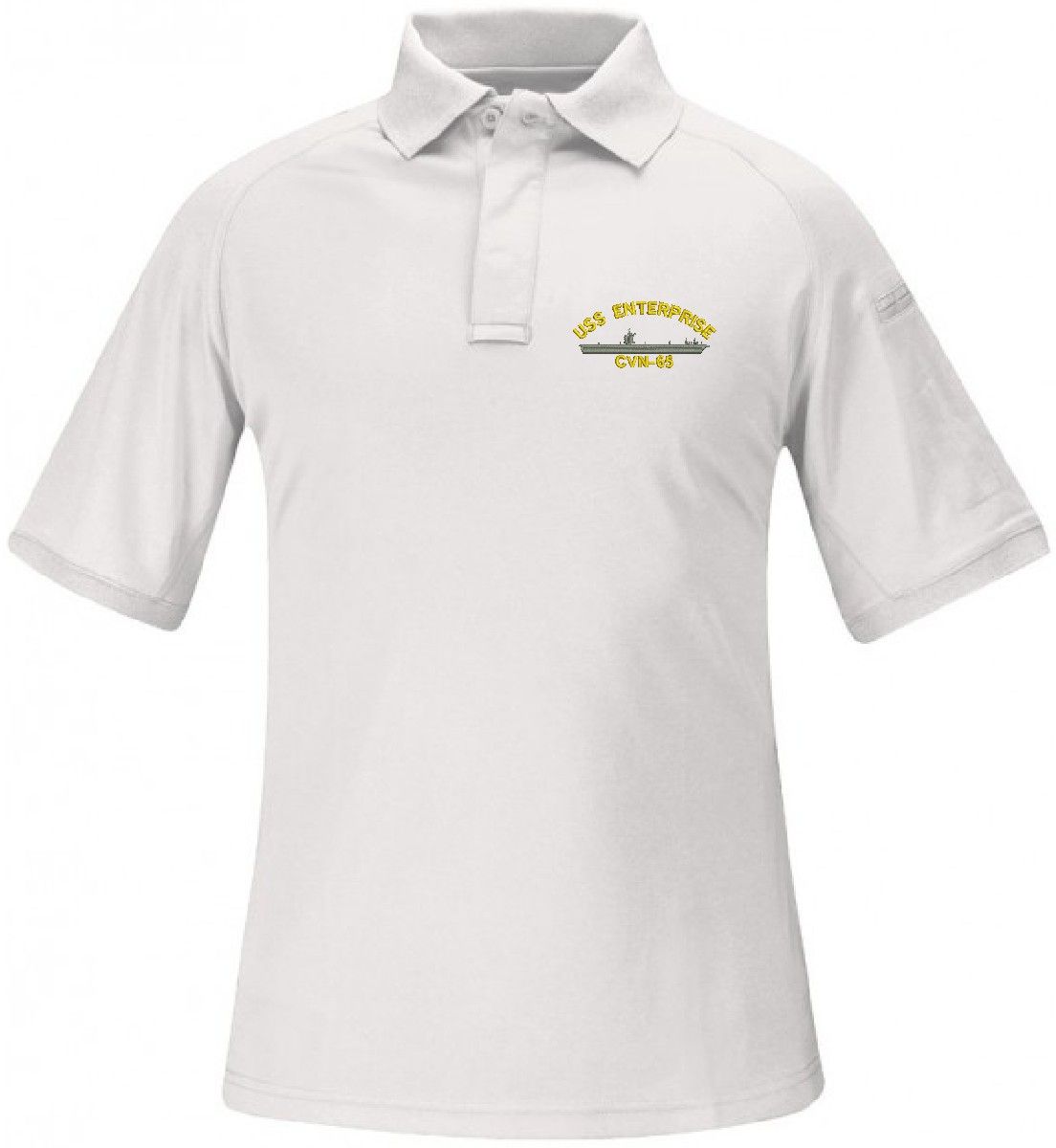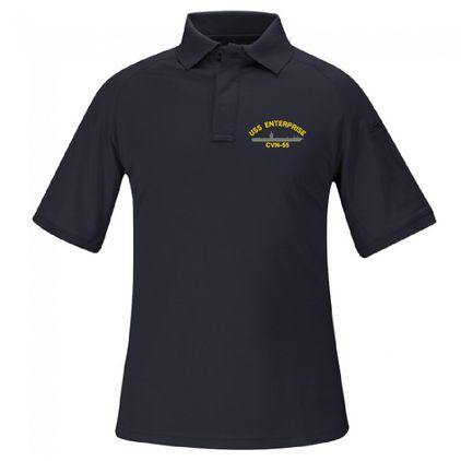 MilitaryBest is proud to offer this USS Enterprise CVN-65 Propper Brand Snag Free Polo Shirt. These polos are Moisture Wicking with a knit so tight that the shirt will not snag. This Polo honors the service of our U.S. Navy personel who have served aboard this ship protecting our freedom with pride. Choose from Black, Navy Blue, and White in Sizes Small - 5XL. These are perfect for honoring your USS Enterprise Navy Veteran. For an additional cost you can also have your Rank & Rate embroidered on the left sleeve of the Polo. All embroidery is performed to order at our facilities in Scottsboro, Alabama by Americans with a passion for patriotism!